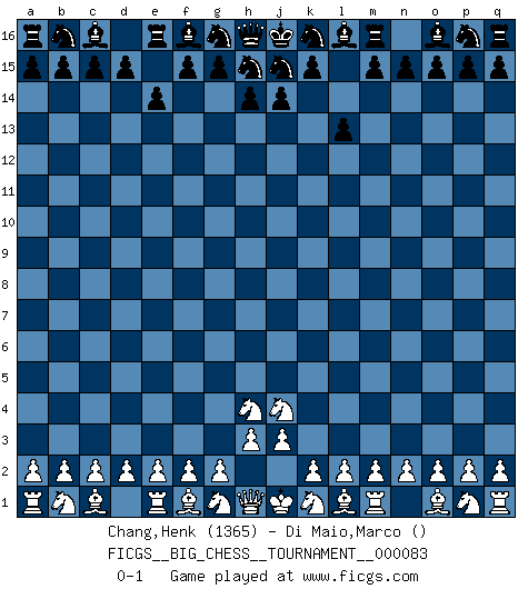 Last move : 0-1 2012 March 13 8:38:53 [Event "FICGS__BIG_CHESS__TOURNAMENT__000083"] [Site "FICGS"] [Date "2012.01.29"] [Round "1"] [White "Chang,Henk"] [Black "Di Maio,Marco"] [Result "0-1"] [WhiteElo "1365"] [BlackElo ""] 1.h2-j4 l15-l13 2.j2-h4 e15-e14 0-1 This big chess game has been lost on time (started : 2012.01.29 18:44:49) Follow this game move after move (download)Fischer Chess play was always razor-sharp, rational and brilliant. One of the best ever. (Dave Regis) Es ist im Leben wie im Schachspiel. Wir entwerfen einen Plan, dieser bleibt jedoch bedingt durch das, was im Schachspiel dem Gegner, im Leben dem Schicksal zu tun belieben wird. (Arthur Schopenhauer) La táctica fluye a partir de una posición superior. (Bobby Fischer) La vie est comme un jeu d'échecs : nous esquissons un plan, mais celui-ci est tributaire de ce que daignent faire l'adversaire aux échecs et le destin dans la vie. (Arthur Schopenhauer) Players are not good because they find tactics, it is about the way to find the positions in which those tactics are hidden. (Luc-Olivier Leclerc)