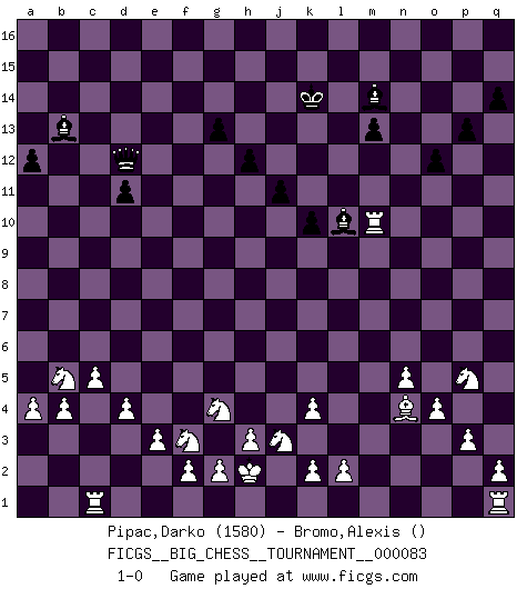 Last move : 1-0 2012 February 21 5:19:51 [Event "FICGS__BIG_CHESS__TOURNAMENT__000083"] [Site "FICGS"] [Date "2012.01.29"] [Round "1"] [White "Pipac,Darko"] [Black "Bromo,Alexis"] [Result "1-0"] [WhiteElo "1580"] [BlackElo ""] 1.j2-k4 k15-k13 2.h1-o7 p16-o14 3.o7-f15 g16-f14 4.f15-o7 n15-n13 5.o7-c7 b16-c14 6.c7-l15 k16-l14 7.l15-n13 l14-n13 8.b1-c3 d15-d13 9.b2-b3 m15-m13 10.c1-b2 o16-m14 11.p1-o3 g15-g13 12.e2-e3 b15-b13 13.n2-n4 l16-n14 14.o1-b13 c16-d15 15.f1-d3 e15-e13 16.d3-g6 f16-b12 17.g6-a12 e16-e14 18.m2-m4 m16-m15 19.l1-o4 f14-g12 20.m1-m3 b12-k4 21.j3-k4 a15-a14 22.b13-e10 h15-f14 23.m3-l3 q15-q14 24.a12-d9 h14-h13 25.d9-c10 e13-e12 26.o4-c15 j15-l14 27.c15-j9 p15-p13 28.k1-j3 o14-n12 29.g1-f3 o15-o13 30.p2-p3 d13-d12 31.c10-b9 d12-d11 32.e10-j6 c14-d12 33.o3-p5 j14-j13 34.o2-o4 j13-j12 35.a2-a4 d15-b13 36.c3-b5 a16-c16 37.a1-c1 o13-o12 38.b2-e5 k13-k12 39.d2-d4 h13-h12 40.c2-c4 a14-a13 41.c4-c5 j12-j11 42.h2-g4 k12-k11 43.n4-n5 k11-k10 44.j9-h8 l14-k12 45.h8-d12 n13-l12 46.b3-b4 q16-l16 47.b9-c8 k12-h11 48.d12-f14 h16-f14 49.c8-g12 l16-l15 50.g12-h11 m15-m16 51.j6-l8 c16-c8 52.h11-e14 c8-l8 53.e14-l8 n12-m10 54.l8-k7 n14-o13 55.k7-e12 j16-j15 56.j1-h2 f14-d12 57.e12-n4 d12-m4 58.e5-g7 a13-a12 59.e1-m1 m4-d12 60.g7-h6 m14-k12 61.h6-m10 l12-m10 62.l3-l15 j15-k14 63.l15-o15 o13-l10 64.o15-o14 m16-m14 65.o14-m14 k12-m14 66.m1-m10 1-0 Follow this game move after move (download)Mistrust is the most necessary characteristic of the Chess player. (Siegbert Tarrasch) Kasparov stellt für gewöhnlich die Regeln auf und bricht sie dann selbst wieder. (Alexej Shirov) La captura del Rey enemigo es la finalidad pero no el primer objetivo de la partida. (William Steinitz) Le joueur d'Echecs qui veut atteindre le top est obligé de développer son propre credo créatif. Alexeï Stepanovicth Souétine. Il est facile d'écrire des livres ! Ce qui est difficile, c'est de jouer ! (Alexeï Stepanovicth Souétine) For to win one hundred victories in one hundred battles is not the acme of skill. To subdue the enemy without fighting is the acme of skill. (Sun Tzu)