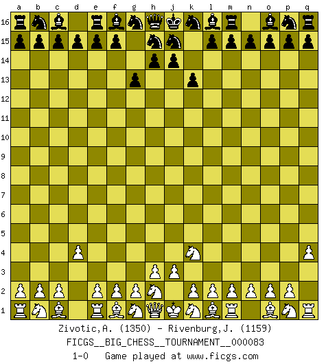 Last move : 1-0 2012 March 9 8:32:44 [Event "FICGS__BIG_CHESS__TOURNAMENT__000083"] [Site "FICGS"] [Date "2012.01.29"] [Round "1"] [White "Zivotic,Aleksandar"] [Black "Rivenburg,John"] [Result "1-0"] [WhiteElo "1350"] [BlackElo "1159"] 1.q2-q4 g15-g13 2.d2-d4 k15-k13 3.j2-k4 1-0 This big chess game has been lost on time (started : 2012.01.29 18:44:49) Follow this game move after move (download)First-class players lose to second class players because second-class players sometimes play a first-class game. (Tarrasch) Es ist nicht das erste mal, dass sich die FIDE dem Arabischen Geld gebeugt hat (über die FIDE WM 2004 in Lybien). (Larry Evans) Las ideas audaces son como las piezas del Ajedrez que avanzan hacia adelante. Ellas pueden ser vencidas, pero también pueden iniciar una partida victoriosa. (Goethe) RxDa4 pat (...) You think that education is too expensive ? Try ignorance. (Derek Bok)