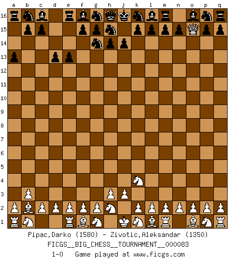 Last move : 1-0 2012 March 5 8:9:46 [Event "FICGS__BIG_CHESS__TOURNAMENT__000083"] [Site "FICGS"] [Date "2012.01.29"] [Round "1"] [White "Pipac,Darko"] [Black "Zivotic,Aleksandar"] [Result "1-0"] [WhiteElo "1580"] [BlackElo "1350"] 1.j2-k4 a15-a13 2.h1-o7 j15-g14 3.o7-o15 d15-d13 4.b2-b3 e15-e13 5.c1-b2 1-0 This big chess game has been lost on time (started : 2012.01.29 18:44:49) Follow this game move after move (download)Half the variations which are calculated in a tournament game turn out to be completely superfluous. Unfortunately, no one knows in advance which half. (Jan Tinman) Im Fernschach kannst du während dem Spiel rauchen. (John Christen Knudsen) Debemos de asegurarnos de que el Ajedrez no se convierta en un lenguaje muerto, muy interesante, pero tan solo para un grupo muy pequeño. (Sytze Faber) Il n'y a pas de prix trop élevé au scalp de l'ennemi. (Koblentz) Good luck. You're gonna need it. (Han Solo in Star Wars ep.6)