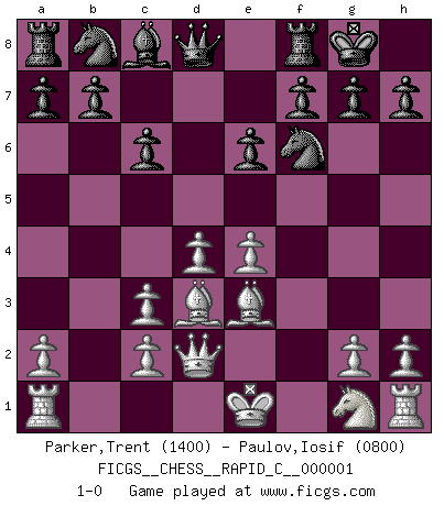 Last move : 1-0 2006 May 24 7:32:6 [Event "FICGS__CHESS__RAPID_C__000001"] [Site "FICGS"] [Date "2006.05.12"] [Round "1"] [White "Parker,Trent"] [Black "Paulov,Iosif"] [Result "1-0"] [WhiteElo "1400"] [BlackElo "0800"] 1.d4 Nf6 2.f3 c6 3.e4 d5 4.Nc3 e6 5.Be3 Bb4 6.Bd3 Bxc3+ 7.bxc3 O-O 8.Qd2 dxe4 9.fxe4 1-0 Paleface attack Kingside Castling by player Black (move 7) Player White won this chess game. Follow this game move after move (download)If I win a tournament, I win it by myself. I do the playing. Nobody helps me. (Bobby Fischer) Ich würde die 30 stärksten Spieler der USA im Simultanspiel besiegen. (José Raúl Capablanca) Morphy probablemente fue el genio más grande de todos. (Bobby Fischer) Vous n'êtes pas toujours obligé de jouer le meilleur coup. Un coup doit être actif, entreprenant, correct et beau ! (David Bronstein) In fact if nothing is done against this teddy bear, hereby I announce that I would quit chess, rapid chess, blitz chess, postal chess, email chess, server chess and correspondence chess I will then switch to a table game where teddy bears aren't going to be seen for a while, like Poker, or Roulette, all 18+ games. (Elmer Valderrama)