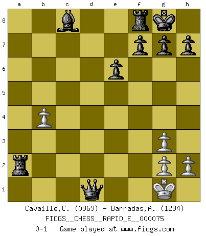 Last move : 0-1 2012 February 5 20:42:11 [Event "FICGS__CHESS__RAPID_E__000075"] [Site "FICGS"] [Date "2012.01.31"] [Round "1"] [White "Cavaille,Cedric"] [Black "Barradas,Anderson"] [Result "0-1"] [WhiteElo "0969"] [BlackElo "1294"] 1.e4 c5 2.Nc3 e6 3.Nf3 Nc6 4.a3 d6 5.d4 Nf6 6.dxc5 dxc5 7.Bc4 a6 8.Nd2 Bd6 9.O-O O-O 10.Nf3 Ne5 11.Nxe5 Bxe5 12.Ne2 Nxe4 13.Ng3 Nd6 14.Qe1 Bxg3 15.fxg3 Nxc4 16.b4 Qd4+ 17.Be3 Nxe3 18.Rf4 Nxc2 19.Rxd4 Nxe1 20.Rxe1 cxd4 21.a4 b5 22.axb5 axb5 23.Re5 d3 24.Rxb5 Ra2 25.Re5 d2 26.Kf2 d1Q 27.Re2 Qxe2+ 28.Kg1 Qd1+ 0-1 Sicilian : Closed Kingside Castling by player White (move 9) Kingside Castling by player Black (move 9) Promotion Queen by player Black (move 26) Player Black won this chess game. Follow this game move after move (download)Fischer sacrificed virtually everything most of us weakies (to use his term) value, respect, and cherish, for the sake of an artful, often beautiful board game, for the ambivalent privilege of being its greatest master. (Paul Kollar) Es ist im Leben wie im Schachspiel. Wir entwerfen einen Plan, dieser bleibt jedoch bedingt durch das, was im Schachspiel dem Gegner, im Leben dem Schicksal zu tun belieben wird. (Arthur Schopenhauer) El juego de Damas es para vagabundos. (Paul Morphy) J'apprécie les joueurs d'est-indienne, c'est grâce à eux que je nourris ma famille depuis tant d'années. (Petrosian) It is not titles that honor men, but men that honor titles. (Niccolo Machiavelli)