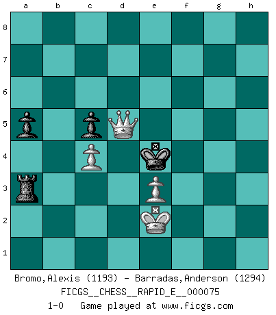 Last move : 1-0 2012 February 7 5:29:0 [Event "FICGS__CHESS__RAPID_E__000075"] [Site "FICGS"] [Date "2012.01.31"] [Round "1"] [White "Bromo,Alexis"] [Black "Barradas,Anderson"] [Result "1-0"] [WhiteElo "1193"] [BlackElo "1294"] 1.d4 Nf6 2.c4 g6 3.Nc3 Bg7 4.Nf3 c6 5.Bf4 d5 6.e3 Bg4 7.Be2 Ne4 8.Nxe4 dxe4 9.Ne5 Bxe2 10.Qxe2 Qa5+ 11.Qd2 Qxd2+ 12.Kxd2 Bxe5 13.Bxe5 O-O 14.h4 Nd7 15.Bf4 h5 16.Rag1 Nf6 17.Bg5 b6 18.Bxf6 exf6 19.g4 Rad8 20.gxh5 Kh7 21.hxg6+ fxg6 22.h5 Kg7 23.Rxg6+ Kf7 24.Rhg1 Rg8 25.b4 Rxg6 26.hxg6+ Kg7 27.a4 c5 28.bxc5 bxc5 29.d5 f5 30.Ke2 a5 31.f3 Rb8 32.fxe4 fxe4 33.Rg4 Rb4 34.Rxe4 Kxg6 35.d6 Rxa4 36.d7 Ra2+ 37.Kd3 Kf5 38.d8Q Ra3+ 39.Ke2 Kxe4 40.Qd5+ 1-0 King's Indian defense, 3.Nc3 Kingside Castling by player Black (move 13) 10 pieces endgame at move 34 : White KRPPPP , Black KRPP WHITE : King + 1 Rook 4 Pawns BLACK : King + 1 Rook 2 Pawns 9 pieces endgame at move 35 : White KRPPP , Black KRPP WHITE : King + 1 Rook 3 Pawns BLACK : King + 1 Rook 2 Pawns Promotion Queen by player White (move 38) 8 pieces endgame at move 39 : White KQPP , Black KRPP WHITE : King + 1 Queen 2 Pawns BLACK : King + 1 Rook 2 Pawns Player White won this chess game. Follow this game move after move (download)Life is a kind of Chess, with struggle, competition, good and ill events. (Benjamin Franklin) Ein Kibitz ist einer, der deinem Gegner gute Ratschläge gibt. (Andrew Soltis) Alekhine es un poeta que crea un trabajo de arte de algo que raramente inspiraría a otra persona a mandar una tarjeta postal. (Max Euwe) Les Echecs, c'est l'art de la guerre sans les charniers, c'est la résurrection des morts tombés au champ d'honneur, l'espoir perpétuel, la suprématie de l'intelligence sur la force, la culture de l'esprit. (F. Szpiner) There is no vagueness without wind. (Chinese proverb)