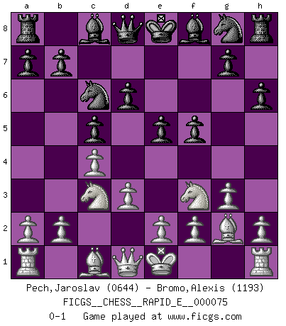 Last move : 0-1 2012 April 13 23:42:47 [Event "FICGS__CHESS__RAPID_E__000075"] [Site "FICGS"] [Date "2012.01.31"] [Round "1"] [White "Pech,Jaroslav"] [Black "Bromo,Alexis"] [Result "0-1"] [WhiteElo "0644"] [BlackElo "1193"] 1.c4 c5 2.Nc3 e5 3.g3 f5 4.Bg2 d6 5.d3 Nc6 6.Nf3 h6 0-1 This chess game has been lost on time (started : 2012.01.31 13:55:26) English : Symmetrical variation Player Black won this chess game. Follow this game move after move (download)Personally, I rather look forward to a computer program winning the world Chess Championship. Humanity needs a lesson in humility. (Richard Dawkings) Unter Putin wird alles Geld aus Russland wie von einem Staubsauger nach Moskau umgeleitet, das ist wie ein schwarzes Loch. (Garry Kasparov) El Ajedrez es una manera fabulosa para que los niños aprendan a autovalorarse y a autoestimarse. (Saudin Robovic) Même un GMI sait rarement calculer sur plus de cinq coups une attaque à sacrifices. (Rudolf Spielmann) There is a great deal of difference between an eager man who wants to read a book and a tired man who wants a book to read. (G.K. Chesterton)