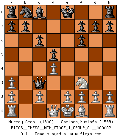 Last move : 0-1 2007 March 2 6:14:12 [Event "FICGS__CHESS__WCH_STAGE_1_GROUP_01__000002"] [Site "FICGS"] [Date "2007.01.16"] [Round "1"] [White "Murray,Grant"] [Black "Sarihan,Mustafa"] [Result "0-1"] [WhiteElo "1300"] [BlackElo "1599"] 1.d4 Nf6 2.Nc3 d5 3.Bg5 c6 4.Bxf6 exf6 5.Nf3 Qb6 6.Na4 Qa5+ 7.Nc3 Ba3 8.bxa3 Qxc3+ 0-1 This chess game has been lost on time (started : 2007.01.16 13:56:58) Queen's pawn game Player Black won this chess game. Follow this game move after move (download)It's always better to sacrifice your opponent's men. (Savielly Tartakover) Du musst Deinen Gegner in einen tiefen dunklen Wald führen wo 2+2=5 ist und wo der Weg, der wieder hinausführt, nur breit genug für einen ist. (Mikhail Nekhemyevich Tal) Todos los jugadores de Ajedrez deberían tener un pasatiempo. (Savielly Tartakower) Il (Jacob Murray) ne joue pas pour le bon coup, mais pour le meilleur. (Eloi Relange) Man is reluctant to give credit for intelligence to anyone, except his enemies. (Albert Einstein)