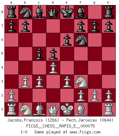 Last move : 1-0 2012 April 12 11:35:32 [Event "FICGS__CHESS__RAPID_E__000075"] [Site "FICGS"] [Date "2012.01.31"] [Round "1"] [White "Jacobs,Francois"] [Black "Pech,Jaroslav"] [Result "1-0"] [WhiteElo "1266"] [BlackElo "0644"] 1.d4 d5 2.Nf3 Nf6 3.e3 c5 4.c3 e6 5.b3 1-0 This chess game has been lost on time (started : 2012.01.31 13:55:26) Queen's pawn game Player White won this chess game. Follow this game move after move (download)Chess, like love, is infectious at any age. (Flohr) Kostenjuk hat keinen Sexappeal. (Loek van Wely) Hasta este punto, las blancas han seguido un análisis bien conocido. Pero ahora el hace un error fatal: empieza a usar su propia cabeza. (Siegbert Tarrasch) Les échecs sont plus proches de l'art de l'assassinat que de l'art de la guerre. (Arturo Perez-Reverte) Creativity is allowing yourself to make mistakes. Art is knowing which ones to keep. (Scott Adams)