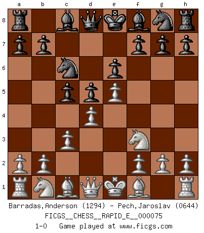 Last move : 1-0 2012 April 11 23:34:59 [Event "FICGS__CHESS__RAPID_E__000075"] [Site "FICGS"] [Date "2012.01.31"] [Round "1"] [White "Barradas,Anderson"] [Black "Pech,Jaroslav"] [Result "1-0"] [WhiteElo "1294"] [BlackElo "0644"] 1.e4 e6 2.d4 d5 3.e5 c5 4.c3 Nc6 5.Nf3 1-0 This chess game has been lost on time (started : 2012.01.31 13:55:26) French : Advance, Paulsen attack Player White won this chess game. Follow this game move after move (download)When you are lonely, when you feel yourself an alien in the world, play Chess. This will raise your spirits and be your counselor in war. (Aristotle) Oft bringt ein stiller Zug das Erdbeben. (Richard Reti) Todo se encuentra en un estado de flujo y esto incluye al mundo del Ajedrez. (Mikhail Botvinnik) Je ne suis pas le dernier à jouer lâchement des coups douteux pendant le zeïtnot de l'adversaire pour l'achever: en effet les coups qui font le plus peur sont ceux que l'on ne comprend pas. Je me fais souvent peur quand je joue. (Un professeur anonyme) Cactus - It is depressed cucumber. (Ilmars Cirulis)