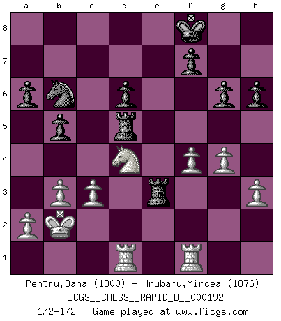 Last move : 1/2-1/2 2012 March 18 11:25:19 [Event "FICGS__CHESS__RAPID_B__000192"] [Site "FICGS"] [Date "2012.01.31"] [Round "1"] [White "Pentru,Oana"] [Black "Hrubaru,Mircea"] [Result "1/2-1/2"] [WhiteElo "1800"] [BlackElo "1876"] 1.e4 c5 2.Nf3 e6 3.d4 cxd4 4.Nxd4 a6 5.Bd3 Bc5 6.Nb3 Ba7 7.Qg4 Nf6 8.Qg3 d6 9.Nc3 Nc6 10.Bg5 h6 11.Bd2 e5 12.O-O-O Be6 13.Nd5 Nh5 14.Qf3 Nf6 15.Kb1 Rc8 16.Qg3 Nh5 17.Qf3 Nf6 18.h3 b5 19.g4 Bxd5 20.exd5 e4 21.Bxe4 Ne5 22.Qg2 Nxe4 23.Qxe4 O-O 24.Be3 Bxe3 25.Qxe3 Qf6 26.Nd4 Nc4 27.Qg3 Rc5 28.Qf3 Qe5 29.c3 Re8 30.Ka1 Qxd5 31.Qxd5 Rxd5 32.b3 Nb6 33.Kb2 g6 34.Rhf1 Kf8 35.f4 Re3 1/2-1/2 Sicilian : Kan, Polugaievsky variation Queenside Castling by player White (move 12) Kingside Castling by player Black (move 23) This chess game ended in a draw. Follow this game move after move (download)By playing at Chess then, we may learn: First: Foresight... Second: Circumspection... Third: Caution... And lastly, we learn by Chess the habit of not being discouraged by present bad appearances in the state of our affairs, the habit of hoping for a favorable chance, and that of persevering in the secrets of resources. (Benjamin Franklin) Alle Schachspieler sollten auch ein Hobby haben. (Savielly Grigorievitsch Tartakower) Me siento como si fuera una pieza en una partida de Ajedrez, cuando mi oponente me indica: esa pieza no puede ser movida. (Soren Kierkegaard) Mon pion favori sur ma case favorite ! Bronstein en parlant d'un coup de pion en h5 quand il avait les Noirs. Internet: Absolute communication, absolute isolation. (Paul Carvel)