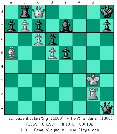 Last move : 1-0 2012 March 18 7:41:26 [Event "FICGS__CHESS__RAPID_B__000192"] [Site "FICGS"] [Date "2012.01.31"] [Round "1"] [White "Tsimbalenko,Dmitry"] [Black "Pentru,Oana"] [Result "1-0"] [WhiteElo "1800"] [BlackElo "1800"] 1.d4 Nf6 2.Nf3 g6 3.c4 Bg7 4.Nc3 O-O 5.e4 d6 6.Be2 e5 7.O-O Nc6 8.d5 Ne7 9.b4 Ne8 10.c5 f5 11.Nd2 Nf6 12.f3 f4 13.Nc4 Bd7 14.Ba3 Nc8 15.Qb3 b6 16.c6 Be8 17.b5 Kh8 18.Bb4 g5 19.a4 Bg6 20.a5 g4 21.axb6 Nxb6 22.Ra3 gxf3 23.Bxf3 Qb8 24.Ra6 Qd8 25.Qa2 Bh5 26.Ra1 Bxf3 27.gxf3 Nxc4 28.Qxc4 Rg8 29.Qf1 Bf8 30.Kh1 Nh5 31.b6 Qh4 32.Ne2 Ng3+ 33.Nxg3 fxg3 34.Qg2 gxh2 35.Qxh2 Qf6 36.Qh3 Qf4 37.b7 Rg3 38.Qh5 Rxf3 39.R6a2 Qxe4 40.Rg2 Rg3 41.Rag1 Rb8 42.Ba5 Rg7 43.Kh2 Qf4+ 44.Kh3 Rxg2 45.Rxg2 Qc1 46.Qg4 Qh1+ 47.Kg3 Be7 48.Qc8+ 1-0 King's Indian : East Indian defense Kingside Castling by player Black (move 4) Kingside Castling by player White (move 7) Player White won this chess game. Follow this game move after move (download)Chess mastery essentially consists of analyzing Chess positions accurately. (Mikhail Botvinnik) Die Elozahlen sind sehr schlecht für das Schach. Jetzt ist Schach eine Sportindustrie, die darauf zielt Elopunkte zu machen. (Miguel Najdorf) En la perfecta combinación de Ajedrez como en una historia corta de primera clase, toda la trama y contra trama deberá conducir hacia un final sorprendente, el interes no es mitigado hasta el último momento. (Yates and Winter) Tous ces prétendus hommes politiques sont les pions, les Cavaliers, les Tours ou les Fous d'une partie d'échecs qui se jouera tant qu'un hasard ne renversera pas l'échiquier. (Honoré de Balzac) Any activity becomes creative when the doer cares about doing it right or doing it better. (John Updike)