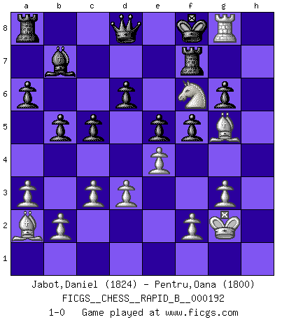 Last move : 1-0 2012 March 20 6:31:22 [Event "FICGS__CHESS__RAPID_B__000192"] [Site "FICGS"] [Date "2012.01.31"] [Round "1"] [White "Jabot,Daniel"] [Black "Pentru,Oana"] [Result "1-0"] [WhiteElo "1824"] [BlackElo "1800"] 1.e4 e5 2.Nf3 Nc6 3.Bb5 a6 4.Ba4 Nf6 5.O-O Be7 6.Re1 b5 7.Bb3 O-O 8.h3 Bb7 9.d3 d6 10.a3 Na5 11.Ba2 c5 12.Nbd2 Nc6 13.c3 Nh5 14.Nf1 Nf4 15.Ne3 Bf6 16.g3 Nxh3+ 17.Kg2 Ng5 18.Rh1 Ne6 19.Nh4 g6 20.Nhf5 Ne7 21.Nh6+ Kg7 22.Qf3 Ng5 23.Qxf6+ Kxf6 24.Neg4+ Kg7 25.Bxg5 f5 26.Nf7 Rxf7 27.Rxh7+ Kxh7 28.Rh1+ Kg8 29.Nf6+ Kf8 30.Rh8+ Ng8 31.Rxg8+ 1-0 Ruy Lopez : Closed, 7...O-O Kingside Castling by player White (move 5) Kingside Castling by player Black (move 7) Player White won this chess game. Follow this game move after move (download)Before the endgame, the Gods have placed the middle game. (Siegbert Tarrasch) Bobby Fischer ist kein Vorbild für die heutige Jugend. (Viktor Kortschnoi) Ciertamente el estado mental actual de Bobby Fischer es una tragedia. Uno de los mas grandes jugadores de Ajedrez del mundo -el orgullo y pena del Ajedrez Americano. (Frank Brady) Tout change constamment, y compris dans le monde des Echecs. (Botvinnik) Do you know these so called Volunteers don't even get paid! (Simpsons)