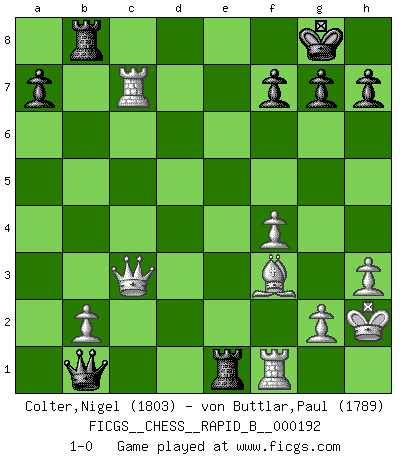 Last move : 1-0 2012 May 15 14:28:10 [Event "FICGS__CHESS__RAPID_B__000192"] [Site "FICGS"] [Date "2012.01.31"] [Round "1"] [White "Colter,Nigel"] [Black "von Buttlar,Paul"] [Result "1-0"] [WhiteElo "1803"] [BlackElo "1789"] 1.d4 d5 2.Nf3 c6 3.c3 Nf6 4.Bf4 e6 5.e3 Qb6 6.Qc2 Nbd7 7.h3 c5 8.Nbd2 Bd6 9.Bxd6 Qxd6 10.Bd3 c4 11.Be2 b5 12.O-O e5 13.dxe5 Nxe5 14.a4 Bd7 15.axb5 Bxb5 16.Nd4 Bd7 17.e4 O-O 18.f4 Nc6 19.e5 Nxd4 20.cxd4 Qb6 21.exf6 Qxd4+ 22.Rf2 Qxf6 23.Qc3 Qg6 24.Bf3 Bc6 25.Ra6 Rfd8 26.Nxc4 dxc4 27.Rxc6 Qb1+ 28.Kh2 Rab8 29.Rxc4 Re8 30.Rc7 Re1 31.Rf1 1-0 Queen's pawn game Kingside Castling by player White (move 12) Kingside Castling by player Black (move 17) Player White won this chess game. Follow this game move after move (download)Some part of a mistake is always correct. (Savielly Tartakover) Jede Eröffnung ist gut genug um gespielt zu werden, wenn nur ihr Ruf schlecht genug ist. (Savielly Grigorievitsch Tartakower) El jugador táctico debe saber que hacer cuando algo se debe de hacer. El estratégico debe saber que hacer cuando nada se debe de hacer. (Savielly Tartakover) Les Echecs sont et restent toujours un combat, un combat intégral comme la boxe, la lutte ou un autre sport, et où il doit y avoir un vainqueur et un vaincu. (Joseph Emil Diemer) The production of too many useful things results in too many useless people. (Karl Marx)