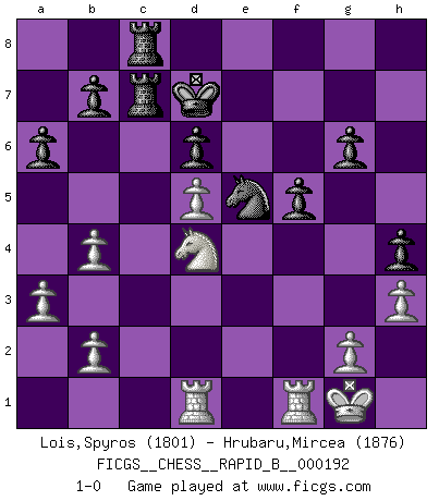 Last move : 1-0 2012 May 25 20:31:4 [Event "FICGS__CHESS__RAPID_B__000192"] [Site "FICGS"] [Date "2012.01.31"] [Round "1"] [White "Lois,Spyros"] [Black "Hrubaru,Mircea"] [Result "1-0"] [WhiteElo "1801"] [BlackElo "1876"] 1.e4 c5 2.Nf3 e6 3.d4 cxd4 4.Nxd4 Qb6 5.Nc3 Bc5 6.Be3 Nc6 7.Na4 Qa5+ 8.c3 Bxd4 9.Bxd4 Nxd4 10.Qxd4 e5 11.Qb4 Qxb4 12.cxb4 Nf6 13.Nc3 d6 14.f3 Ke7 15.Bc4 Rd8 16.Kf2 Be6 17.Bd5 Bxd5 18.exd5 Rdc8 19.a3 Kd7 20.Rad1 Ng8 21.Rhe1 f5 22.f4 Nf6 23.fxe5 Ng4+ 24.Kg1 Nxe5 25.Re2 g6 26.h3 Rc4 27.Nb5 a6 28.Nd4 Rac8 29.R2e1 h5 30.Kf2 h4 31.Kg1 R4c7 32.Rf1 1-0 Sicilian defense Player White won this chess game. Follow this game move after move (download)If cunning alone were needed to excel, women would be the best Chess players. (Albin) Du kannst im Schach nur gut werden, wenn du das Spiel liebst. (Robert James Fischer) Fischer era un maestro de claridad y un Rey del posicionamiento astuto. Sus oponentes podían ver hacia donde se dirigía pero eran impotentes para detenerlo. (Bruce Pandolfini) Le pion, dans sa simplicité, marche droit devant lui, mais lorsqu'il prend, il le fait obliquement? Ainsi l'homme, tant qu'il reste pauvre, marche dans la droiture et vit honnêtement, mais lorsqu'il recherche les honneurs, il flatte, se parjure et, par les voies obliques, cherche une position supérieure sur l'échiquier du monde. (Jean de Galles) The only thing that matters is the evidence. (Horatio Caine, C.S.I. Miami)