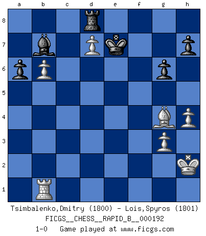Last move : 1-0 2012 May 15 8:20:23 [Event "FICGS__CHESS__RAPID_B__000192"] [Site "FICGS"] [Date "2012.01.31"] [Round "1"] [White "Tsimbalenko,Dmitry"] [Black "Lois,Spyros"] [Result "1-0"] [WhiteElo "1800"] [BlackElo "1801"] 1.d4 Nf6 2.Nf3 e6 3.c4 b6 4.g3 Bb7 5.Bg2 Be7 6.O-O O-O 7.Nc3 Ne4 8.Qc2 Nxc3 9.Qxc3 c5 10.Rd1 d6 11.b3 Nd7 12.Bb2 Bf6 13.Qc2 Qc7 14.e4 cxd4 15.Nxd4 a6 16.Rd2 Rac8 17.Rad1 Nc5 18.a4 Rfd8 19.f4 Qd7 20.Bf3 Be7 21.h4 g6 22.Qc3 f6 23.e5 fxe5 24.fxe5 d5 25.Kh2 Bf8 26.Qe3 Qe7 27.Ba3 dxc4 28.Bg4 c3 29.Qxc3 Bh6 30.Rf2 Qe8 31.Qe1 Bd5 32.a5 Nxb3 33.axb6 Nxd4 34.Rxd4 Qc6 35.Rb2 Qb7 36.Qf2 Bg7 37.Bd6 Rxd6 38.exd6 Bxd4 39.Qxd4 Rc1 40.Bd1 Qg7 41.Rd2 Qxd4 42.Rxd4 Rc8 43.Rb4 Bb7 44.Bb3 Rd8 45.Bxe6+ Kg7 46.d7 Kf6 47.Bg4 Ke7 48.Rb1 1-0 Queen's pawn game Kingside Castling by player White (move 6) Kingside Castling by player Black (move 6) Player White won this chess game. Follow this game move after move (download)It is difficult to play against Einstein's theory --on his first loss to Fischer. (Mikhail Tal) Ich verachte Kasparow. (Viktor Kortschnoi) El Ajedrez detiene a su maestro dentro de sus propios vínculos, encadenando la mente y el cerebro, por lo que la libertad interior del mas fuerte debe sufrir. (Albert Einstein) Le génie consiste à savoir transgresser les règles au moment opportun. (Teichmann) The project of the man are lower than those of the sky. (Chinese proverb)