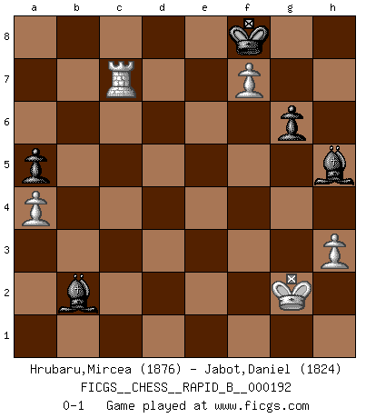 Last move : 0-1 2012 May 27 8:31:48 [Event "FICGS__CHESS__RAPID_B__000192"] [Site "FICGS"] [Date "2012.01.31"] [Round "1"] [White "Hrubaru,Mircea"] [Black "Jabot,Daniel"] [Result "0-1"] [WhiteElo "1876"] [BlackElo "1824"] 1.d4 Nf6 2.c4 c6 3.Nc3 d5 4.Nf3 dxc4 5.a4 Bf5 6.Ne5 Nbd7 7.Nxc4 Nb6 8.Ne5 a5 9.f3 Nfd7 10.Nxd7 Nxd7 11.e4 Bg6 12.f4 e6 13.Bc4 Nb6 14.Bb3 Qh4+ 15.g3 Qh3 16.Kf2 Bb4 17.Qf3 Nd7 18.g4 Qxf3+ 19.Kxf3 h5 20.g5 h4 21.Be3 O-O-O 22.Rac1 Rhe8 23.h3 Kb8 24.Rhf1 Re7 25.Bf2 Nb6 26.d5 Nd7 27.Bc2 Bh5+ 28.Kg2 exd5 29.exd5 Nc5 30.dxc6 bxc6 31.Bxh4 Nd3 32.Bxd3 Rxd3 33.Rce1 Rd2+ 34.Rf2 Rd4 35.Rxe7 Bxe7 36.Bg3 Kb7 37.f5 Bxg5 38.Be5 Rd3 39.f6 g6 40.Ne4 Be3 41.Rc2 Rd5 42.Nd6+ Kc7 43.Nxf7 Kd7 44.Bg3 Bd4 45.Nd6 Rxd6 46.Bxd6 Kxd6 47.f7 Ke7 48.Rxc6 Bxb2 49.Rc7+ Kf8 0-1 Queen's pawn game Queenside Castling by player Black (move 21) 10 pieces endgame at move 48 : White KRPPP , Black KBBPP WHITE : King + 1 Rook 3 Pawns BLACK : King + 2 Bishops 2 Pawns Player Black won this chess game. Follow this game move after move (download)All I want to do, ever, is just play Chess. (Bobby Fischer) Als er Schachweltmeister wurde ließ er praktisch alle stärksten Sovietspieler für sich arbeiten. Wenn ein auch nur mittelmässiger Meister ein Spezialist für eine bestimmte Eröffnung war, wurde er von Karpov gerufen. Das wurde alles geheim gehalten. (Mikhail Moiseyevich Botvinik) Me siento como si fuera una pieza en una partida de Ajedrez, cuando mi oponente me indica: esa pieza no puede ser movida. (Soren Kierkegaard) La menace est plus forte que l'exécution. (Aaron Nimzovitch) Without deviation from the norm, progress is not possible. (Frank Zappa)