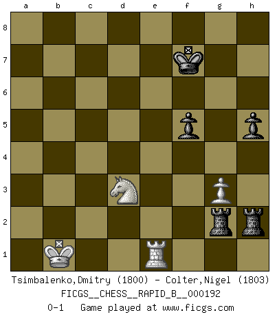 Last move : 0-1 2012 May 24 20:59:12 [Event "FICGS__CHESS__RAPID_B__000192"] [Site "FICGS"] [Date "2012.01.31"] [Round "1"] [White "Tsimbalenko,Dmitry"] [Black "Colter,Nigel"] [Result "0-1"] [WhiteElo "1800"] [BlackElo "1803"] 1.Nf3 d5 2.d4 e6 3.g3 Nf6 4.Bg2 Be7 5.O-O O-O 6.Ne5 Nbd7 7.f4 c5 8.e3 Qc7 9.Nd2 Rb8 10.a4 b6 11.c4 Bb7 12.b3 Rfd8 13.Bb2 h6 14.Rc1 a6 15.Qe2 dxc4 16.bxc4 Bxg2 17.Kxg2 Qb7+ 18.Qf3 Nxe5 19.fxe5 Qxf3+ 20.Kxf3 Nd7 21.d5 f6 22.exf6 Bxf6 23.Bxf6 Nxf6 24.e4 b5 25.axb5 axb5 26.e5 Nd7 27.Ne4 Nxe5+ 28.Ke2 exd5 29.cxd5 c4 30.d6 b4 31.Rcd1 c3 32.Rd5 Re8 33.Rc5 Nd7 34.Rc7 Nf6 35.Rxf6 gxf6 36.Kd3 Rf8 37.Kc2 Rbe8 38.Kd3 f5 39.Nc5 Re1 40.d7 Rd8 41.Kc2 Re2+ 42.Kc1 Kf8 43.Nd3 Ke7 44.Nxb4 Rxh2 45.Rxc3 Rxd7 46.Nd3 Ra7 47.Kb1 R7a2 48.Nf4 Raf2 49.Re3+ Kf7 50.Re1 h5 51.Nd3 Rfg2 0-1 Reti Opening Kingside Castling by player White (move 5) Kingside Castling by player Black (move 5) 10 pieces endgame at move 45 : White KRNPP , Black KRRPP WHITE : King + 1 Rook 1 Knight 2 Pawns BLACK : King + 2 Rooks 2 Pawns 9 pieces endgame at move 45 : White KRNP , Black KRRPP WHITE : King + 1 Rook 1 Knight 1 Pawn BLACK : King + 2 Rooks 2 Pawns Player Black won this chess game. Follow this game move after move (download)Chess is a terrible game. If you have no center, your opponent has a freer position. If you do have a center, then you really have something to worry about ! (Siegbert Tarrasch) Pläne sind die Träume des Verständigen. (Ernst Freiherr von Feuchtersleben) Yo tuve un dolor de muelas en la primer partida. En el segundo juego, tuve un dolor de cabeza. En el tercero, tuve un ataque de reumatÃsmo. En la cuarta partida, no me sentÃa muy bien. ¿Y en el quinto juego? Bueno, ¿que acaso uno tiene que ganar todos los juegos?. (Siegbert Tarrasch) Il vaut mieux sacrifier les pièces de l'adversaire. (Xavier Tartacover) Empty your mind, be formless, shapeless — like water. (Bruce Lee)