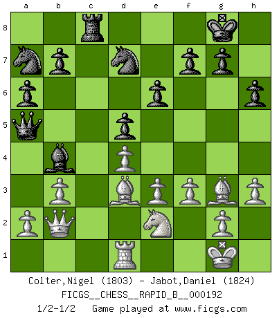 Last move : 1/2-1/2 2012 April 20 23:10:45 [Event "FICGS__CHESS__RAPID_B__000192"] [Site "FICGS"] [Date "2012.01.31"] [Round "1"] [White "Colter,Nigel"] [Black "Jabot,Daniel"] [Result "1/2-1/2"] [WhiteElo "1803"] [BlackElo "1824"] 1.d4 Nf6 2.Nf3 d5 3.c4 c6 4.cxd5 cxd5 5.Nc3 Nc6 6.Bf4 Bf5 7.Qb3 Na5 8.Qa4+ Bd7 9.Qc2 Rc8 10.e3 e6 11.Bd3 Be7 12.O-O a6 13.h3 Nc4 14.Rac1 O-O 15.b3 Na3 16.Qb2 Qa5 17.Ne5 h6 18.Nxd7 Nxd7 19.Rfd1 Bb4 20.Ne2 Nb5 21.Rxc8 Rxc8 22.f3 Na7 23.Bg3 Ba3 24.Qd2 Bb4 25.Qb2 Ba3 26.Qd2 Bb4 27.Qb2 1/2-1/2 Queen's pawn game Kingside Castling by player White (move 12) Kingside Castling by player Black (move 14) This chess game ended in a draw. Follow this game move after move (download)Of Chess it has been said that life is not long enough for it, but that is the fault of life, not Chess. (William Ewart Napier) Als ich elf wurde, wurde ich einfach gut. (Robert James Fischer) Fischer es una tragedia del Ajedrez Americano a la par con Morphy y Pillsbury. (Mig Greengard) Echiquier : carré parfait, comme la Jérusalem nouvelle décrite par l'auteur de l'Apocalypse, huit cases sur huit, exaltation du chiffre 4, symbole du cosmos aux quatre horizons... où le noir et le blanc, l'ombre et la lumière, le mal et le bien s'entremêlent et se conjuguent. (Robert Couffignal, Le Gambit du poète) All the troubles of the world come from being unable to sit alone in a quiet room. (Blaise Pascal)