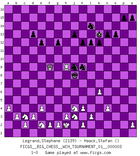 Last move : 1-0 2012 May 28 2:22:37 [Event "FICGS__BIG_CHESS__WCH_TOURNAMENT_01__000003"] [Site "FICGS"] [Date "2012.01.31"] [Round "1"] [White "Legrand,Stephane"] [Black "Haack,Stefan"] [Result "1-0"] [WhiteElo "2139"] [BlackElo ""] 1.m2-m4 n15-n13 2.p1-o3 m15-m13 3.e2-e4 e15-e13 4.b1-c3 d15-d13 5.j2-k4 p16-o14 6.f1-c4 f16-b12 7.l1-o4 b12-k4 8.j3-k4 b16-c14 9.d2-d3 o16-f8 10.l2-l3 l15-l13 11.h1-p8 f8-c5 12.c1-e3 c5-e3 13.e1-e3 q16-p16 14.n2-n3 g15-g13 15.e3-f3 h16-g15 16.a1-e1 k16-l14 17.h2-j4 j15-k13 18.k1-j3 h15-j13 19.o1-g8 l13-l12 20.g8-j10 c16-j10 21.c4-j10 l16-p12 22.f3-f6 g13-g12 23.e1-e3 k13-l11 24.j10-l8 p12-l8 25.p8-l8 a16-d16 26.e3-f3 f15-f14 27.o4-p5 l11-j12 28.l8-m9 k15-k13 29.m9-b9 e13-e12 30.b9-b15 d16-d14 31.f6-c6 e16-b16 32.b15-a14 b16-b14 33.a14-a3 h14-h13 34.f3-f5 m13-m12 35.m4-m5 k13-k12 36.m5-m6 o14-m13 37.m1-m5 o15-o13 38.f5-f7 m13-l11 39.f7-c7 g16-e15 40.n3-n4 j13-h11 41.b2-b3 j14-j13 42.a3-a8 m16-m13 43.p5-n3 b14-b15 44.n3-c13 d14-e14 45.c13-e15 c14-e15 46.c7-c15 b15-c15 47.c6-c15 e14-c14 48.a8-a15 c14-c15 49.a15-c15 j16-h15 50.g1-e2 p16-c16 51.c15-b15 m13-m16 52.m5-a5 c16-b16 53.b15-c15 m16-c16 54.c15-k8 h15-j14 55.a5-a15 b16-a16 56.k8-a8 a16-a15 57.a8-a15 e15-f13 58.a15-a14 j12-h10 59.q1-m1 f13-g11 60.a14-c16 g11-h9 61.m1-m5 h11-j9 62.m5-h5 g15-a15 63.c16-g16 j14-k14 64.h5-h9 a15-o2 65.h9-h10 o2-p2 66.h10-h13 p2-o3 67.h13-h14 k14-l13 68.g16-h16 l13-m13 69.h16-j16 o3-o1 70.j1-h2 o1-f9 71.a2-a4 l11-k9 72.j16-p16 m13-l13 73.p16-h16 l13-m13 74.h14-h9 f9-j6 75.h16-f14 j6-j8 76.f14-f9 1-0 This big chess game has been lost on time (started : 2012.01.31 17:58:39) Follow this game move after move (download)Chess is a part of culture and if a culture is declining then Chess too will decline. (Mikhail Botvinnik) Das Schachspiel hat wie die Liebe, die Musik, die Fähigkeit, den Menschen glücklich zu machen. Ich habe ein leises Gefühl des Bedauerns für jeden, der das Schachspiel nicht kennt, so wie ich jeden bedaure, der die Liebe nicht kennt. (Siegbert Tarrasch) ¿Quién es tu oponente esta tarde? Esta tarde mi oponente son las piezas negras. (Akiba Rubinstein) L'attaque fait le spectacle, la défense gagne les matchs. (Dicton footballistique) Big Chess is a place for big hallucinations. (Thibault de Vassal)