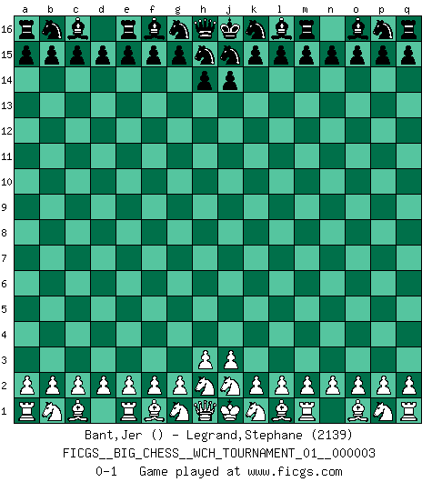 Last move : 0-1 2012 March 1 19:59:39 [Event "FICGS__BIG_CHESS__WCH_TOURNAMENT_01__000003"] [Site "FICGS"] [Date "2012.01.31"] [Round "1"] [White "Bant,Jer"] [Black "Legrand,Stephane"] [Result "0-1"] [WhiteElo ""] [BlackElo "2139"] 0-1 This big chess game has been lost on time (started : 2012.01.31 17:58:39) Follow this game move after move (download)Let the perfectionist play postal. (Yasser Seirawan) Mutter, ich bin eben Ex-Weltmeister geworden. --beim nach Hause Kommen nach dem Verlust des WM-Titels an Mihail Botvinnik -- (Mikhail Nekhemyevich Tal) Es el objetivo de la escuela moderna no tratar cada posición de acuerdo a una regla general, sino de acuerdo al principio inherente en la posición. (Richard Reti) Avant la finale, les dieux ont créé le milieu de partie. (Tarrasch) Luck never made a man wise. (Seneca, Letters to Lucilius)