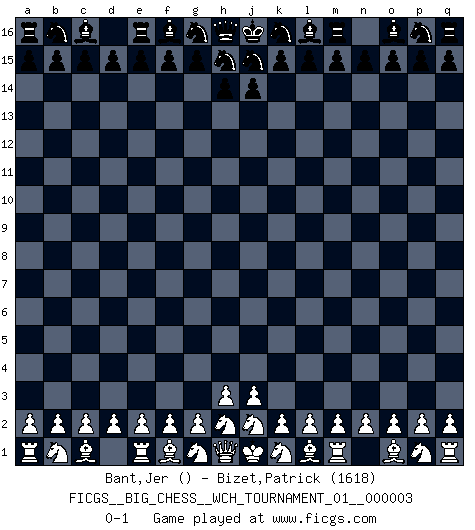 Last move : 0-1 2012 March 1 19:59:39 [Event "FICGS__BIG_CHESS__WCH_TOURNAMENT_01__000003"] [Site "FICGS"] [Date "2012.01.31"] [Round "1"] [White "Bant,Jer"] [Black "Bizet,Patrick"] [Result "0-1"] [WhiteElo ""] [BlackElo "1618"] 0-1 This big chess game has been lost on time (started : 2012.01.31 17:58:39) Follow this game move after move (download)Nonsense was the last thing Fischer was interested in, as far as Chess was concerned. (Elie Agur) Sie führen leise Selbstgespräche, schlürfen lautstark ihre Getränke, schmatzen hörbar beim Essen, blasen ihrem Gegenüber Rauch in die Augen, niesen ihm ins Gesicht, starren ihn unverwandt an, bis er sich unter ihren Blicken windet, rutschen ständig auf ihrem Stuhl hin und her, rülpsen und bohren in der Nase. (Anonymous) Tu no necesitas jugar muy bien, únicamente ayudar a tu oponenet a que juegue muy mal. (Genrikh Chepukaitis) C'est la seule position que je connaisse où les deux camps sont mals. Propos prêtés à V. Anand. The best teachers teach from the heart, not from the book. (Author unknown)
