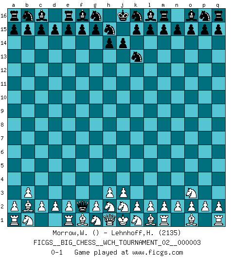 Last move : 0-1 2012 February 2 5:3:37 [Event "FICGS__BIG_CHESS__WCH_TOURNAMENT_02__000003"] [Site "FICGS"] [Date "2012.01.31"] [Round "1"] [White "Morrow,Wolff"] [Black "Lehnhoff,Heinz-Georg"] [Result "0-1"] [WhiteElo ""] [BlackElo "2135"] 1.b2-b3 j15-k13 2.c1-b2 h16-o10 3.p1-o3 o10-f2 0-1 Follow this game move after move (download)It is the aim of the modern school, not to treat every position according to one general law, but according to the principle inherent in the position. (Richard Reti) Das Spiel gibt uns die Genugtuung, die das Leben uns versagt. (Emanuel Lasker) Bobby Fischer es el mas grande genio de Ajedrez de todos los tiempos. (Alexander Kotov) Psychologiquement, tu dois avoir confiance en toi même, mais cette confiance doit être basée sur des faits. (Robert Fischer) I'll be back. (Arnold Schwarzenegger)