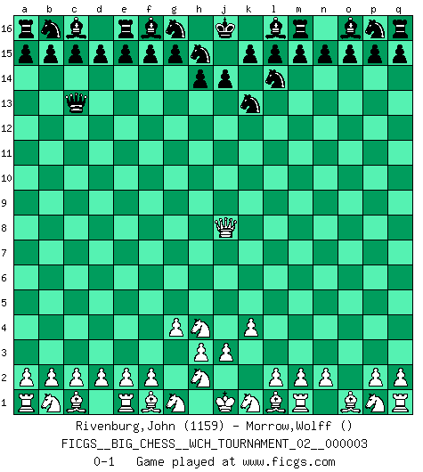 Last move : 0-1 2012 March 7 8:14:31 [Event "FICGS__BIG_CHESS__WCH_TOURNAMENT_02__000003"] [Site "FICGS"] [Date "2012.01.31"] [Round "1"] [White "Rivenburg,John"] [Black "Morrow,Wolff"] [Result "0-1"] [WhiteElo "1159"] [BlackElo ""] 1.g2-g4 k16-l14 2.h1-a8 j15-k13 3.k2-k4 h16-o10 4.j2-h4 o10-o2 5.a8-j8 o2-c13 0-1 This big chess game has been lost on time (started : 2012.01.31 18:0:44) Follow this game move after move (download)The most powerful weapon in Chess is to have the next move. (David Bronstein) Privat ist Kortschnoi kein schlechter Mensch, sehr sympathisch. Aber während des Spiels ist er grausam. Er will dich töten. (Miguel Najdorf) ¡Examina movidas que hagan daño! Un buen ojo for movidas desvastantes es mucho mas importante que el conocimiento de principios estratégicos. (Purdy) Même si vous avez un bon coup à faire, regardez toujours s'il n'y en a pas un qui lui soit préférable. (Pedro Damiano) God is an atheist. (Unknown)