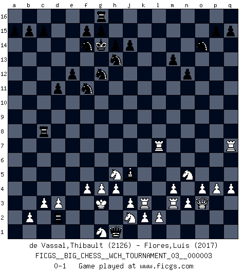 Last move : 0-1 2012 November 1 14:46:39 [Event "FICGS__BIG_CHESS__WCH_TOURNAMENT_03__000003"] [Site "FICGS"] [Date "2012.01.31"] [Round "1"] [White "de Vassal,Thibault"] [Black "Flores,Luis"] [Result "0-1"] [WhiteElo "2126"] [BlackElo "2017"] 1.j2-k4 j15-h13 2.h1-o7 p16-o14 3.o7-c7 h15-j13 4.h2-g4 b16-c14 5.m2-m4 m15-m13 6.p1-o3 k16-l14 7.l1-p5 g16-f14 8.e2-e4 e15-e13 9.b1-c3 d15-d13 10.f1-b5 n15-n13 11.e4-e5 o16-g9 12.d2-d3 f16-c13 13.c1-h6 l16-p12 14.k1-h2 c16-l8 15.g1-j2 q16-n16 16.n2-n3 a16-d16 17.j2-h4 n13-n12 18.o1-j6 l8-j6 19.h4-j6 n16-n13 20.h2-k3 n13-o13 21.k3-h4 h16-p9 22.q2-q4 c13-b14 23.m1-m3 e13-e12 24.e1-e4 e16-e13 25.e4-f4 p9-l13 26.m3-l3 l13-m12 27.q1-m1 g9-h10 28.a1-e1 h10-g11 29.c7-b7 m12-m9 30.j1-h2 m9-q5 31.b7-m7 d13-d12 32.m1-m2 e13-b13 33.o3-n5 q5-k11 34.o2-o4 j16-j15 35.e1-e3 d16-d13 36.a2-a4 d12-d11 37.m2-m3 j13-g12 38.l3-l4 g11-f10 39.m3-l3 d13-c13 40.l4-l7 c13-c9 41.l7-l11 k11-k12 42.h6-f8 f10-g9 43.l11-l9 c9-c8 44.f8-g9 b14-g9 45.e3-e4 o13-o8 46.p5-q6 k12-j11 47.q6-o8 c8-o8 48.f4-f7 g9-d12 49.e4-f4 o8-p8 50.p2-p4 b13-b8 51.f4-f5 j11-b4 52.c3-d1 b4-d2 53.g4-e3 d2-e1 54.f5-k5 e1-p1 55.b5-l14 k15-l14 56.l9-l14 j15-h15 57.l14-l15 h15-g14 58.k5-k15 p1-k1 59.k4-h5 b8-g8 60.m7-o7 m16-g16 61.o7-m7 c14-e13 62.l15-o15 p12-l16 63.k15-k3 e13-f11 64.f7-l7 l16-n14 65.o15-n15 n14-o13 66.m7-m5 d12-g9 67.n15-l15 g9-m14 68.l15-l14 m14-n13 69.l7-q7 n13-e5 70.f2-f4 e5-b8 71.h4-f3 o13-p12 72.j6-k4 b8-d10 73.g2-g4 g8-a8 74.m5-o3 p8-c8 75.c2-c3 p12-m15 76.l14-l7 m15-a4 77.f3-g1 a4-d1 78.e3-d1 a8-a1 79.l3-m3 a1-d1 80.k4-j2 d1-d2 81.h2-g3 d10-j5 82.h3-h4 k1-h1 0-1 Follow this game move after move (download)For me, Chess is life and every game is like a new life. Every Chess player gets to live many lives in one lifetime. (Eduard Gufeld) Ich verstehe Aljechins Kombinationen ganz gut; aber woher er diese Angriffschancen bekommt und wie er die Eröffnung behandelt das ist für mich ein Buch mit sieben Siegeln. (Rudolf Spielmann) Solo los afeminados hacen el Enroque. (Rob Sillars) Il n'y a pas eu de défaite parce que je ne crois pas que cet ordinateur ait jamais existé. IBM a triché en refusant d'imprimer les modes de recherche de la machine. C'est évident, pendant le match, des coups décisifs ont été joués par des êtres humains. Aujourd'hui, les meilleurs spécialistes en informatique ne peuvent toujours pas expliquer comment Deep-Blue a pu jouer contre la logique des ordinateurs. IBM a gagné une guerre de communication, mais ils sont incapables de prouver que l'ordinateur a gagné tout seul. (Garry Kasparov) If you ain't just a little scared when you enter a casino, you are either very rich or you haven't studied the games enough. (Pappy)