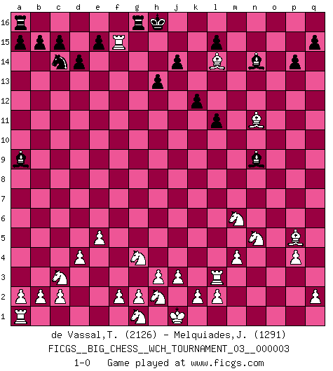 Last move : 1-0 2012 May 1 19:50:35 [Event "FICGS__BIG_CHESS__WCH_TOURNAMENT_03__000003"] [Site "FICGS"] [Date "2012.01.31"] [Round "1"] [White "de Vassal,Thibault"] [Black "Melquiades,Jay"] [Result "1-0"] [WhiteElo "2126"] [BlackElo "1291"] 1.j2-k4 j15-h13 2.h1-o7 g15-g14 3.o7-o15 p16-o14 4.o15-f7 n15-n14 5.f7-f15 h15-f14 6.f15-g14 k16-h15 7.g14-c10 b16-c14 8.e2-e4 d15-d14 9.m2-m4 o16-f8 10.c10-f10 f8-m14 11.h2-g4 f14-e12 12.f10-p10 p15-p14 13.f1-b5 o14-m13 14.b1-c3 m16-o16 15.k1-h2 o16-o2 16.p1-o3 q16-o16 17.k4-m3 h16-o10 18.p10-o10 o16-o10 19.m3-o2 m14-d6 20.e4-e5 d6-a9 21.m1-m3 c16-o5 22.n2-n4 g16-f14 23.n4-o5 o10-o5 24.p2-p4 o5-o13 25.l1-p5 f14-g12 26.o2-n4 h13-j11 27.o1-p2 m13-n11 28.d2-d4 k15-k13 29.c1-n11 h14-h13 30.q1-o1 h15-j13 31.o3-n5 j13-l12 32.o1-o13 n14-o13 33.n11-l9 m15-m13 34.n4-m6 f16-n9 35.p2-e12 j16-h16 36.m3-l3 e16-f16 37.e1-e3 f16-g16 38.e3-f3 g12-f10 39.f3-f10 j11-h9 40.e12-h9 k13-k12 41.h9-l12 m13-l12 42.f10-f15 l16-n14 43.b5-l14 o13-o12 44.l9-o12 l12-l11 45.o12-n11 1-0 Follow this game move after move (download)The combination player thinks forward; he starts from the given position, and tries the forceful moves in his mind. (Emanuel Lasker) Mit Schach schule ich mein Gefühl für Geometrie, was für Tennis und Schach gleichermaßen wichtig ist. (Boris Becker) Un mal plan es mejor que no tener ningún plan. (Frank Marshall) Pour se monter efficace, un Cavalier a besoin d'avant-postes ! Les Cavaliers font les meilleurs bloqueurs de pions passés. There is a very easy way to return from a casino with a small fortune : go there with a large one. (Jack Yelton)