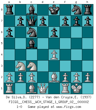 Last move : 1-0 2007 April 8 4:19:33 [Event "FICGS__CHESS__WCH_STAGE_1_GROUP_02__000002"] [Site "FICGS"] [Date "2007.01.16"] [Round "1"] [White "De Silva,Dinesh"] [Black "Van den Cruyce,Els"] [Result "1-0"] [WhiteElo "2277"] [BlackElo "1937"] 1.e4 c5 2.Nf3 e6 3.d4 cxd4 4.Nxd4 Nc6 5.Nc3 Qc7 6.Be2 a6 7.O-O Bc5 8.Nb3 1-0 This chess game has been lost on time (started : 2007.01.16 15:12:15) Sicilian : Taimanov (Bastrikov) variation Kingside Castling by player White (move 7) Player White won this chess game. Follow this game move after move (download)When you are lonely, when you feel yourself an alien in the world, play Chess. This will raise your spirits and be your counselor in war. (Aristotle) Alles was am Schachbrett zählt sind gute Züge. (Robert James Fischer) Un juego de Ajedrez es un dialogo, una conversación entre un jugador y su oponente. Cada movimiento del oponente puede contener amenazas o tropiezos, pero un jugador no se puede defender de las amenazas o tomar ventaja de los tropiezos si es que no se pregunta a sí mismo: ¿Que es lo que mi oponente va a hacer después de cada movida?. (Bruce A. Moon) Plusieurs personnes se sont demandées comment Tal faisait pour gagner... En fait, c'est très simple ! Il met ses pièces au centre de l'échiquier et les sacrifie quelque part ! (David Bronstein) All politicians must be presumed guilty until they are proven innocent. (Dinesh De Silva)
