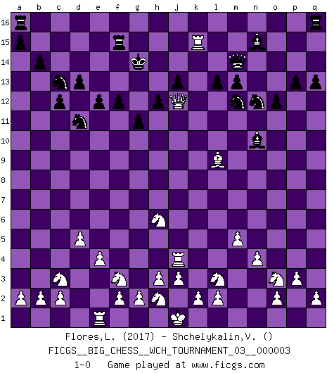 Last move : 1-0 2012 June 9 12:0:50 [Event "FICGS__BIG_CHESS__WCH_TOURNAMENT_03__000003"] [Site "FICGS"] [Date "2012.01.31"] [Round "1"] [White "Flores,Luis"] [Black "Shchelykalin,Vyacheslav"] [Result "1-0"] [WhiteElo "2017"] [BlackElo ""] 1.j2-h4 h15-g13 2.p1-o3 j15-k13 3.g1-f3 e15-e13 4.k1-l3 n15-n13 5.b1-c3 f15-f13 6.m2-m4 m15-m13 7.e2-e4 g16-f14 8.h1-n6 d15-d13 9.n6-n13 l15-l13 10.d2-d4 k16-l14 11.n13-j9 f16-d14 12.f1-b5 h16-k14 13.n2-n4 e13-e12 14.j9-m9 h14-h13 15.l1-q6 g15-g14 16.c1-l9 f14-h15 17.o1-f9 l14-m12 18.q1-n1 q15-q13 19.m9-o9 o15-o13 20.l9-m10 p16-o14 21.m4-m5 o14-n12 22.m10-f4 k14-p14 23.p2-p3 l16-m15 24.q6-o4 d14-o4 25.o9-o4 e16-e15 26.f4-k8 g13-e14 27.a1-d1 e15-f15 28.d4-d5 f13-f12 29.m1-m4 b16-d15 30.f9-h11 d15-c13 31.d1-d4 c16-d15 32.d4-c4 g14-g13 33.c4-c7 g13-g12 34.h11-d7 h15-g13 35.m4-j4 j16-h15 36.h4-k5 p14-k14 37.c7-c9 c13-d11 38.c9-b9 b15-b14 39.n1-m1 d15-a12 40.d7-e8 a12-e8 41.b5-e8 c15-c13 42.m1-m4 k13-l11 43.e8-b11 c13-c12 44.b11-f7 g13-j12 45.f7-e6 g12-g11 46.m4-k4 j14-j13 47.k5-h6 k14-j14 48.b9-b13 e14-c13 49.b13-b7 h13-h12 50.b7-p7 m15-k13 51.o4-p4 k13-n10 52.p7-p14 m16-m14 53.p14-m14 j14-m14 54.p4-p6 o16-n15 55.e6-d7 p15-p13 56.k8-l9 o13-o12 57.k4-k15 h15-g14 58.d7-j12 l11-j12 59.p6-j12 1-0 Follow this game move after move (download)He who fears an isolated Queen's Pawn should give up Chess. (Siegbert Tarrasch) Als er Schachweltmeister wurde ließ er praktisch alle stärksten Sovietspieler für sich arbeiten. Wenn ein auch nur mittelmässiger Meister ein Spezialist für eine bestimmte Eröffnung war, wurde er von Karpov gerufen. Das wurde alles geheim gehalten. (Mikhail Moiseyevich Botvinik) El Ajedrez no es una pizca de inferior al violín, y tenemos un gran número de violinistas profesionales. (Mikhail Botvinnik) L'ordinateur a tué l'originalité. Il n'y a plus guère d'aventures sur l'échiquier. (Jacob Murray) If you know the enemy and know yourself you need not fear the results of a hundred battles. (Sun Tzu)