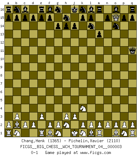Last move : 0-1 2012 March 10 8:32:17 [Event "FICGS__BIG_CHESS__WCH_TOURNAMENT_04__000003"] [Site "FICGS"] [Date "2012.01.31"] [Round "1"] [White "Chang,Henk"] [Black "Pichelin,Xavier"] [Result "0-1"] [WhiteElo "1365"] [BlackElo "2110"] 1.j2-k4 m15-m13 2.h1-o7 g15-g14 3.o7-o15 p16-o14 4.b2-b3 j15-l14 5.c1-b2 h16-q8 6.e2-e3 q8-q11 0-1 This big chess game has been lost on time (started : 2012.01.31 18:3:5) Follow this game move after move (download)Life is a kind of Chess, with struggle, competition, good and ill events. (Benjamin Franklin) Ein unbeabsichtigtes Patt ist der Gipfel der Dummheit. (Anonymous) El poder defensivo de una pieza clavada, solamente es imaginario. (Aaron Nimzovich) Les Echecs, c'est l'art de la guerre sans les charniers, c'est la résurrection des morts tombés au champ d'honneur, l'espoir perpétuel, la suprématie de l'intelligence sur la force, la culture de l'esprit. (F. Szpiner) They say poker is a zero-sum game. It must be, because every time I play my sum ends up zero. (Max Shapiro)