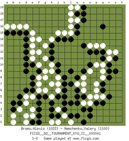Last move : 1-0 2012 August 15 9:11:20 [Event "FICGS__GO__TOURNAMENT_KYU_II__000041"] [Site "FICGS"] [Date "2012.01.31"] [Round "1"] [Black "Bromo,Alexis"] [White "Nemchenko,Valery"] [Result "1-0"] [Rating 1 "1022"] [Rating 2 "1100"] 1.q16 d4 2.q4 d16 3.d10 e12 4.d11 f10 5.k4 j6 6.j5 g6 7.g5 e5 8.f4 f6 9.e8 g9 10.j9 h7 11.k6 j7 12.k7 j8 13.k8 h9 14.j10 h10 15.h11 g11 16.h12 g13 17.h13 h14 18.j14 j15 19.k14 k15 20.l14 l16 21.m16 l15 22.m15 m17 23.n17 l18 24.m18 l17 25.n18 e3 26.f3 e2 27.f2 g8 28.e7 f7 29.d6 e9 30.d9 e11 31.d12 e13 32.d13 e14 33.d14 e15 34.d15 h5 35.h4 c16 36.c15 b16 37.b15 a16 38.a15 f12 39.e10 f8 40.f9 f14 41.e6 d5 42.c5 c3 43.c4 d2 44.e1 d1 45.f1 b1 46.b3 b2 47.b4 m19 48.n19 l19 49.f5 p7 50.q6 p5 51.p4 q5 52.r5 p6 53.q7 q8 54.r8 q9 55.r9 q10 56.r10 r11 57.s11 s12 58.s9 o4 59.o3 n4 60.n3 m3 61.m4 n2 62.m2 l3 63.o2 m5 64.l4 m1 65.n1 l1 66.l2 k2 67.k3 j1 68.k1 l1 69.j2 j3 70.k1 h1 71.h2 k2 72.h3 l5 73.k5 l6 74.l7 m7 75.n5 o5 76.m6 n6 77.m5 l8 78.m8 n7 79.l9 n8 80.n9 o9 81.o10 p10 82.q11 r12 83.q12 q13 84.p12 p13 85.o12 o13 86.n13 1-0 Here are the names of the openings (joseki) played in the four corners : Corner q4 : q4 p7 Hoshi (Hwajeom, Seongjeom, Xingwei`) 4-4 Point. The star or hoshi (4-4) point, emphasizing influence at the potential expense of territory. Player Black won this Go (weiqi, baduk) game. Follow this game move after move (download)Go uses the most elemental materials and concepts - line and circle, wood and stone, black and white - combining them with simple rules to generate subtle strategies and complex tactics that stagger the imagination. (Iwamoto Kaoru, 9 dan professional Go player and former Honinbo title holder) Industry executives and analysts often mistakenly talk about strategy as if it were some kind of chess match. But in chess, you have just two opponents, each with identical resources, and with luck playing a minimal role. The real world is much more like a poker game, with multiple players trying to make the best of whatever hand fortune has dealt them. In our industry, Bill Gates owns the table until someone proves otherwise. (David Moschella, 'Computerworld')