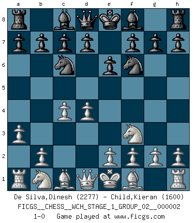 Last move : 1-0 2007 March 25 21:16:18 [Event "FICGS__CHESS__WCH_STAGE_1_GROUP_02__000002"] [Site "FICGS"] [Date "2007.01.16"] [Round "1"] [White "De Silva,Dinesh"] [Black "Child,Kieran"] [Result "1-0"] [WhiteElo "2277"] [BlackElo "1600"] 1.d4 Nf6 2.c4 Nc6 3.Nf3 e6 4.a3 1-0 This chess game has been lost on time (started : 2007.01.16 15:12:15) Kevitz-Trajkovich defense Player White won this chess game. Follow this game move after move (download)All that matters on the Chessboard is good moves. (Bobby Fischer) Schach ist das Spiel, das die Verrückten gesund hält. (Albert Einstein) El Ajedrez es un mar en el cual un mosquito puede beber y un elefante puede bañarse. (Refrán Hindú) Le plus grand jeu de l'esprit jamais inventé, plus vous l'apprenez, plus vous y prenez du plaisir. (Garry Kasparov) The greatest con, that he ever pulled... was making you believe... that he is you. (Revolver, movie)