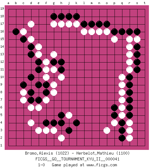 Last move : 1-0 2012 May 6 0:45:2 [Event "FICGS__GO__TOURNAMENT_KYU_II__000041"] [Site "FICGS"] [Date "2012.01.31"] [Round "1"] [Black "Bromo,Alexis"] [White "Herbelot,Mathieu"] [Result "1-0"] [Rating 1 "1022"] [Rating 2 "1100"] 1.q16 d4 2.q4 d17 3.d10 o3 4.k4 r3 5.q3 r4 6.r5 r2 7.q2 q5 8.p5 q6 9.r6 p4 10.p6 q7 11.r7 q8 12.r8 q9 13.r9 q10 14.r10 r11 15.s11 r12 16.s12 r13 17.s13 r14 18.s14 r15 19.r16 s15 20.s16 c7 21.d7 d6 22.d8 e6 23.e7 f7 24.f8 g8 25.f9 c8 26.c9 g9 27.g10 h10 28.h11 f10 29.e9 g11 30.g12 f12 31.e11 g13 32.h12 f11 33.e12 e13 34.d13 e14 35.d14 d15 36.c15 c16 37.b16 p15 38.p16 o16 39.o17 n16 40.n17 m16 41.m17 l16 42.l17 k17 43.k18 j17 44.j18 h17 45.h18 g17 46.g18 g3 47.h4 h2 48.j3 j5 49.g4 f3 50.f4 e3 51.h5 1-0 This go game has been lost on time (started : 2012.01.31 22:44:38) Here are the names of the openings (joseki) played in the four corners : Corner q4 : q4 o3 Hoshi (Hwajeom, Seongjeom, Xingwei`) 4-4 Point. The star or hoshi (4-4) point, emphasizing influence at the potential expense of territory. Ikken Kakari (Hankan Keolch'im, Yi Gua`jiao~, 1-Space Low Approach). White 2 is the standard approach move to the 4-4. Corner q16 : q16 r11 Hoshi (Hwajeom, Seongjeom, Xingwei`) 4-4 Point. The star or hoshi (4-4) point, emphasizing influence at the potential expense of territory. Corner d16 : d17 h11 Komoku (Somok, Xiao~mu`) 3-4 Point. The komoku (3-4) point is the traditional corner enclosure move.. Player Black won this Go (weiqi, baduk) game. Follow this game move after move (download)There are players who don't accept exchange: they play many moves that perpetuate a previous state of the game. (Pierre Audouard) Man is reluctant to give credit for intelligence to anyone, except his enemies. (Albert Einstein)
