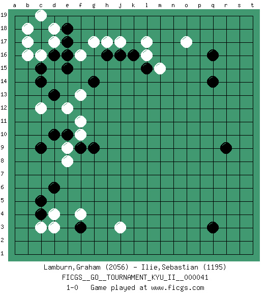 Last move : 1-0 2012 April 4 23:18:31 [Event "FICGS__GO__TOURNAMENT_KYU_II__000041 "] [Site "FICGS"] [Date "2012.01.31"] [Round "1"] [Black "Lamburn,Graham "] [White "Ilie,Sebastian "] [Result "1-0"] [Rating 1 "2056"] [Rating 2 "1195"] 1.q16 d17 2.q3 d4 3.r9 o17 4.q14 l17 5.c14 c12 6.c17 c16 7.d16 b17 8.c18 b18 9.c15 b16 10.e17 d18 11.e18 c19 12.e15 f16 13.e16 g17 14.g14 e12 15.h16 h17 16.j16 j17 17.k16 l16 18.l15 m15 19.f3 j3 20.d6 f4 21.c4 c3 22.c5 d3 23.c9 e9 24.e10 f10 25.d10 f11 26.f9 e8 27.g9 f13 28.d13 1-0 This go game has been lost on time (started : 2012.01.31 22:44:38) Here are the names of the openings (joseki) played in the four corners : Corner q16 : q16 o17Hoshi (Hwajeom, Seongjeom, Xingwei`) 4-4 Point. The star or hoshi (4-4) point, emphasizing influence at the potential expense of territory.Ikken Kakari (Hankan Keolch'im, Yi Gua`jiao~, 1-Space Low Approach). White 2 is the standard approach move to the 4-4. Corner d16 : d17 c14Komoku (Somok, Xiao~mu`) 3-4 Point. The komoku (3-4) point is the traditional corner enclosure move..Niken Kakari (Dukan Keolch'im, E`r Gua`jiao~, 2-Space Low Approach). Black 2 is used with friendly forces backing it up. Its purpose is to prevent a pincer. Locally it results in a loss, but may be appropriate fuseki strategy. It was popular in the late 1950s and early 1960s, but is not seen often nowadays, having been replaced by the one-space high approach, with which it has points in common. Corner d4 : d4 f3Hoshi (Hwajeom, Seongjeom, Xingwei`) 4-4 Point. The star or hoshi (4-4) point, emphasizing influence at the potential expense of territory.Ikken Kakari (Hankan Keolch'im, Yi Gua`jiao~, 1-Space Low Approach). Black 2 is the standard approach move to the 4-4. Player Black won this Go (weiqi, baduk) game.Follow this game move after move (download ) With less than 15 stones in danger, tenuki. (Anonymous) Now the reason the enlightened prince and the wise general conquer the enemy whenever they move and their achievements surpass those of ordinary men is foreknowledge. (Sun Tzu)