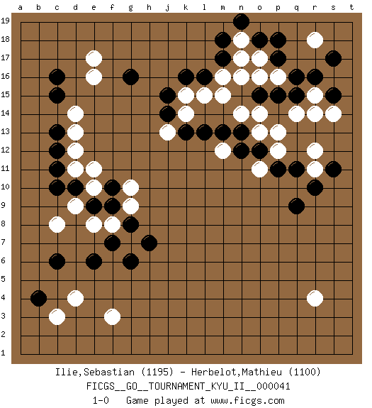 Last move : 1-0 2012 August 15 13:22:43 [Event "FICGS__GO__TOURNAMENT_KYU_II__000041"] [Site "FICGS"] [Date "2012.01.31"] [Round "1"] [Black "Ilie,Sebastian"] [White "Herbelot,Mathieu"] [Result "1-0"] [Rating 1 "1195"] [Rating 2 "1100"] 1.q16 d4 2.c16 r4 3.c6 f3 4.b4 c8 5.c10 c3 6.e6 e8 7.g6 d11 8.c11 d12 9.c12 d13 10.c13 d14 11.c15 e16 12.d10 e10 13.e9 d9 14.f9 f8 15.f10 e11 16.g8 g7 17.f7 g9 18.h7 g10 19.k16 q14 20.q11 p16 21.p17 o17 22.p15 o16 23.q15 n14 24.g16 e17 25.m17 m16 26.l16 m15 27.o15 n16 28.k13 k14 29.j14 k15 30.j15 j13 31.l13 l15 32.n12 o13 33.o12 p13 34.p18 r14 35.s15 n18 36.m18 m12 37.m13 p12 38.p11 o11 39.n13 r11 40.r10 r12 41.q9 r15 42.r16 r18 43.s17 s14 44.o18 n17 45.n19 o14 46.s11 1-0 This go game has been lost on time (started : 2012.01.31 22:44:38) Here are the names of the openings (joseki) played in the four corners : Corner d4 : d4 c6 Hoshi (Hwajeom, Seongjeom, Xingwei`) 4-4 Point. The star or hoshi (4-4) point, emphasizing influence at the potential expense of territory. Ikken Kakari (Hankan Keolch'im, Yi Gua`jiao~, 1-Space Low Approach). Black 2 is the standard approach move to the 4-4. Corner d16 : c16 d11 Komoku (Somok, Xiao~mu`) 3-4 Point. The komoku (3-4) point is the traditional corner enclosure move.. Corner q16 : q16 q14 Hoshi (Hwajeom, Seongjeom, Xingwei`) 4-4 Point. The star or hoshi (4-4) point, emphasizing influence at the potential expense of territory. Ikken Takagakari (Hankan Nop'dakeolch'im, Yi Gaojia, 1-Space High Approach). Black typically responds at 6-4 or 3-10. Black 4-10 is played when Black finds play on the right side advantageous. Black 4-8 or 3-8 may be played when Black has support at top. Corner q4 : r4 q9 Komoku (Somok, Xiao~mu`) 3-4 Point. The komoku (3-4) point is the traditional corner enclosure move.. Player Black won this Go (weiqi, baduk) game. Follow this game move after move (download)On the second line six die, eight live. (Anonymous) It is not true that people stop pursuing dreams because they grow old, they grow old because they stop pursuing dreams. (Gabriel Garcia Marquez)