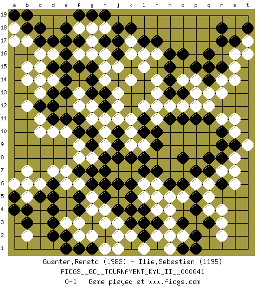 Last move : 0-1 2012 December 12 18:7:7 [Event "FICGS__GO__TOURNAMENT_KYU_II__000041"] [Site "FICGS"] [Date "2012.01.31"] [Round "1"] [Black "Guanter,Renato"] [White "Ilie,Sebastian"] [Result "0-1"] [Rating 1 "1982"] [Rating 2 "1195"] 1.d4 c16 2.q16 r4 3.e16 h16 4.e14 c13 5.c17 b17 6.d17 b15 7.h17 g17 8.j17 f16 9.f17 f18 10.e17 h18 11.f15 g16 12.j16 h14 13.g14 j15 14.j18 k16 15.h19 g18 16.l17 l16 17.m17 h11 18.f11 d10 19.c14 b14 20.e18 d14 21.g15 h15 22.h13 j13 23.h12 j12 24.k15 k14 25.f19 l15 26.g19 c6 27.d11 c11 28.d12 e10 29.c12 b12 30.d13 c15 31.d15 f3 32.f4 g4 33.f5 e3 34.d3 b5 35.d6 d7 36.c5 e6 37.d5 b7 38.b4 r14 39.o16 s16 40.r17 r11 41.p4 n3 42.q3 r3 43.o3 n4 44.p2 r2 45.n2 m2 46.j4 g5 47.g6 f6 48.a5 b6 49.h6 j3 50.k3 h3 51.l2 n1 52.k4 j2 53.d2 b2 54.b3 o2 55.p5 k2 56.n6 l5 57.k6 l6 58.r6 q6 59.l4 l1 60.m5 m4 61.l7 m6 62.m7 n5 63.o6 r7 64.o8 k7 65.k5 m5 66.k8 j7 67.h8 j8 68.j9 k9 69.l8 h9 70.j10 h10 71.h7 k10 72.j6 j11 73.q14 r13 74.s17 s15 75.f10 o14 76.q7 s6 77.r8 s7 78.q8 s8 79.r10 s10 80.s9 t9 81.r9 s11 82.q11 q12 83.p11 p12 84.o11 n12 85.n11 m12 86.l11 m11 87.m10 k11 88.l10 l12 89.n15 f9 90.e11 c14 91.g9 f8 92.n14 o12 93.g1 g2 94.f1 h1 95.e2 f2 96.e1 g8 97.g10 g12 98.g13 f12 99.e13 g11 100.l3 q5 101.k1 j1 102.f7 e7 103.g7 c10 104.b18 a18 105.b19 p14 106.p15 q13 107.q15 k17 108.k18 t17 109.t18 t16 110.r18 m16 111.n16 p6 112.p7 o5 113.p1 h4 114.h5 m14 115.n13 m13 116.m3 q4 117.j8 l9 118.m9 a6 119.a4 d16 120.e15 f13 121.o1 n2 122.o13 p13 123.r15 s14 124.a19 a17 125.c18 pass 0-1 Here are the names of the openings (joseki) played in the four corners : Corner d16 : c16 e16 Komoku (Somok, Xiao~mu`) 3-4 Point. The komoku (3-4) point is the traditional corner enclosure move.. Ikken Takagakari (Hankan Nop'dakeolch'im, Yi Gaogua`jiao~, 1-Space High Approach). The 5-4 approach move has become more popular in modern times, as modern Go emphasizes speed and influence. Corner d4 : d4 c6 Hoshi (Hwajeom, Seongjeom, Xingwei`) 4-4 Point. The star or hoshi (4-4) point, emphasizing influence at the potential expense of territory. Ikken Kakari (Hankan Keolch'im, Yi Gua`jiao~, 1-Space Low Approach). White 2 is the standard approach move to the 4-4. Corner q4 : r4 p4 Komoku (Somok, Xiao~mu`) 3-4 Point. The komoku (3-4) point is the traditional corner enclosure move.. Ikken Takagakari (Hankan Nop'dakeolch'im, Yi Gaogua`jiao~, 1-Space High Approach). The 5-4 approach move has become more popular in modern times, as modern Go emphasizes speed and influence. Player White won this Go (weiqi, baduk) game. Follow this game move after move (download)Strike at the waist of the knight's move. (Anonymous) Luck never made a man wise. (Seneca, Letters to Lucilius)