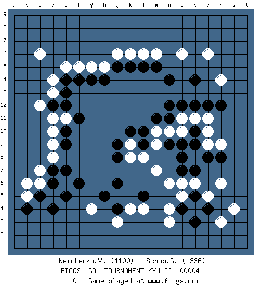 Last move : 1-0 2012 September 13 6:27:17 [Event "FICGS__GO__TOURNAMENT_KYU_II__000041"] [Site "FICGS"] [Date "2012.01.31"] [Round "1"] [Black "Nemchenko,Valery"] [White "Schub,Guillaume"] [Result "1-0"] [Rating 1 "1100"] [Rating 2 "1336"] 1.q4 c16 2.d4 q16 3.p14 r14 4.q12 o16 5.n14 c6 6.e7 d8 7.e5 d11 8.e9 d9 9.e10 k4 10.j6 g4 11.f6 n4 12.l5 l4 13.j4 j3 14.h5 r6 15.q8 p6 16.o8 s4 17.o4 o5 18.p3 n3 19.p5 n6 20.p7 q5 21.p9 m7 22.n9 l8 23.l9 k16 24.m15 m16 25.k15 l16 26.l15 j16 27.j15 k9 28.k10 m9 29.l10 m10 30.m11 n10 31.n11 o10 32.o9 o11 33.n12 q11 34.p12 q10 35.j9 k8 36.j8 q9 37.r8 r9 38.r12 r3 39.o7 o6 40.p10 p11 41.o12 h15 42.h14 g15 43.g14 f15 44.f14 e15 45.e14 d14 46.e13 d13 47.d12 c12 48.e12 e11 49.f11 d10 50.d7 c7 51.c5 b5 52.b4 b6 53.d6 1-0 This go game has been lost on time (started : 2012.01.31 22:44:38) Here are the names of the openings (joseki) played in the four corners : Corner q16 : q16 p14 Hoshi (Hwajeom, Seongjeom, Xingwei`) 4-4 Point. The star or hoshi (4-4) point, emphasizing influence at the potential expense of territory. Corner d4 : d4 c6 Hoshi (Hwajeom, Seongjeom, Xingwei`) 4-4 Point. The star or hoshi (4-4) point, emphasizing influence at the potential expense of territory. Ikken Kakari (Hankan Keolch'im, Yi Gua`jiao~, 1-Space Low Approach). White 2 is the standard approach move to the 4-4. Corner q4 : q4 n4 Hoshi (Hwajeom, Seongjeom, Xingwei`) 4-4 Point. The star or hoshi (4-4) point, emphasizing influence at the potential expense of territory. Niken Takagakari (Dukan Nop'dakeolch'im, E`r Gaojia, 2-Space High Approach). White 2 is a light approach move. Rarely played in even games, White 2 is typically employed in handicap games. Black continues with 6-4 or 3-10. In Korean Sunjang Baduk Black has a stone on 8-4. Player Black won this Go (weiqi, baduk) game. Follow this game move after move (download)The enemy's vital point is your own. (Anonymous) Do you know these so called Volunteers don't even get paid! (Simpsons)