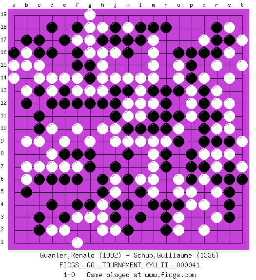 Last move : 1-0 2012 September 27 20:51:59 [Event "FICGS__GO__TOURNAMENT_KYU_II__000041"] [Site "FICGS"] [Date "2012.01.31"] [Round "1"] [Black "Guanter,Renato"] [White "Schub,Guillaume"] [Result "1-0"] [Rating 1 "1982"] [Rating 2 "1336"] 1.d16 q4 2.d4 q17 3.r11 r15 4.r6 o3 5.s4 r3 6.s3 f3 7.k4 d2 8.f4 g3 9.g4 d10 10.c3 h4 11.e3 e2 12.c2 h3 13.h5 j5 14.j4 j6 15.h6 l6 16.m4 o6 17.l5 m6 18.j3 j2 19.k2 h2 20.l3 f1 21.o4 p4 22.n3 o5 23.n4 m5 24.k6 d7 25.d6 e7 26.e6 d14 27.d12 f13 28.f12 g13 29.g12 f10 30.e13 e14 31.c10 c9 32.c11 e9 33.c6 c7 34.g8 h10 35.h12 h13 36.j11 j9 37.j7 k9 38.j13 j14 39.c13 c14 40.k13 f17 41.f16 g16 42.f15 f14 43.e17 g17 44.g15 h15 45.c17 b16 46.b17 b15 47.d18 m15 48.j17 j16 49.l17 m16 50.n18 k18 51.k17 h18 52.h17 h16 53.j18 g19 54.f18 g18 55.l18 m17 56.m18 k14 57.m13 l14 58.n12 n9 59.q9 r7 60.q7 r5 61.s5 q6 62.s6 r10 63.q10 q8 64.p7 s11 65.r9 s10 66.n8 r8 67.p8 s8 68.s9 t9 69.t8 t7 70.s7 r12 71.q11 s12 72.t6 m8 73.n7 m7 74.o16 b13 75.b12 d13 76.e12 o15 77.p15 o14 78.p16 a14 79.k8 l9 80.o9 g9 81.n10 m9 82.p6 p5 83.f8 f7 84.g7 b6 85.b5 b7 86.e8 d8 87.f6 o2 88.n2 q2 89.r14 s14 90.r16 q14 91.s15 r13 92.p14 s16 93.s17 t15 94.q16 s18 95.r17 t17 96.r18 l13 97.l12 k12 98.j12 k11 99.k10 l11 100.l10 m12 101.g14 h14 102.m10 j10 103.m11 l12 104.n13 m14 105.o13 p12 106.q12 p13 107.q13 o10 108.n11 p11 109.o11 b9 110.a16 c15 111.c16 a15 112.k16 1-0 Here are the names of the openings (joseki) played in the four corners : Corner q16 : q17 r11 Komoku (Somok, Xiao~mu`) 3-4 Point. The komoku (3-4) point is the traditional corner enclosure move.. Corner q4 : q4 r6 Hoshi (Hwajeom, Seongjeom, Xingwei`) 4-4 Point. The star or hoshi (4-4) point, emphasizing influence at the potential expense of territory. Ikken Kakari (Hankan Keolch'im, Yi Gua`jiao~, 1-Space Low Approach). Black 2 is the standard approach move to the 4-4. Corner d4 : d4 f3 Hoshi (Hwajeom, Seongjeom, Xingwei`) 4-4 Point. The star or hoshi (4-4) point, emphasizing influence at the potential expense of territory. Ikken Kakari (Hankan Keolch'im, Yi Gua`jiao~, 1-Space Low Approach). White 2 is the standard approach move to the 4-4. Corner d16 : d16 d14 Hoshi (Hwajeom, Seongjeom, Xingwei`) 4-4 Point. The star or hoshi (4-4) point, emphasizing influence at the potential expense of territory. Ikken Takagakari (Hankan Nop'dakeolch'im, Yi Gaojia, 1-Space High Approach). Black typically responds at 6-4 or 3-10. Black 4-10 is played when Black finds play on the right side advantageous. Black 4-8 or 3-8 may be played when Black has support at top. Player Black won this Go (weiqi, baduk) game. Follow this game move after move (download)The game plays itself, the players don't control it. (Pierre Audouard) Pushing plastic is for the many, pushing virtual pieces is for the fewer, pushing wood is for the very few. (Normajean Yates)