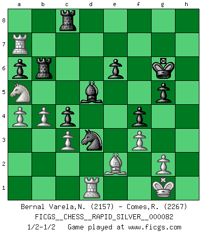 Last move : 1/2-1/2 2012 May 22 6:31:51 [Event "FICGS__CHESS__RAPID_SILVER__000082"] [Site "FICGS"] [Date "2012.02.01"] [Round "1"] [White "Bernal Varela,Nelson"] [Black "Comes,Ruben"] [Result "1/2-1/2"] [WhiteElo "2157"] [BlackElo "2267"] 1.e4 c5 2.Nf3 d6 3.d4 cxd4 4.Nxd4 Nf6 5.Nc3 a6 6.Bg5 e6 7.Be2 Be7 8.Qd3 b5 9.Bf3 Ra7 10.a4 b4 11.Na2 h6 12.Bxf6 Bxf6 13.Nxb4 Rb7 14.e5 Rxb4 15.exf6 Qxf6 16.Qc3 Qe5+ 17.Be2 Qc5 18.Qxc5 dxc5 19.Nb3 Nd7 20.f3 Ke7 21.Kd2 Bb7 22.Na5 Bd5 23.b3 Ne5 24.h4 g6 25.Ke3 f5 26.Rab1 Rc8 27.c3 Rb6 28.Rhd1 g5 29.hxg5 hxg5 30.Rh1 f4+ 31.Kf2 c4 32.b4 Nd3+ 33.Kg1 R6b8 34.Rh6 Kf7 35.Rh7+ Kg6 36.Ra7 Rb6 37.Rd1 Nb2 38.Ra1 Nd3 39.Rd1 Nb2 40.Ra1 Nd3 41.Rd1 1/2-1/2 Sicilian : Najdorf, 6...e6 This chess game ended in a draw. Follow this game move after move (download)Bobby Fischer's current state of mind is indeed a tragedy. One of the world's greatest Chess players - the pride and sorrow of American Chess. (Frank Brady) Woher wissen wir, daß der Neanderthaler Blindschach gespielt hat? -- Bei Ausgrabungen wurden keine Schachbretter und Figuren gefunden. (Anonymous) Un buen jugador siempre tiene buena suerte. (José Raúl Capablanca) Nous vivons dans un monde échiquéen : chaque jour qui passe est un défi à relever. (Philosophe Sasha) The only thing that matters is the evidence. (Horatio Caine, C.S.I. Miami)