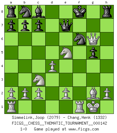 Last move : 1-0 2012 February 11 16:26:41 [Event "FICGS__CHESS__THEMATIC_TOURNAMENT__000142"] [Site "FICGS"] [Date "2012.02.01"] [Round "1"] [White "Simmelink,Joop"] [Black "Chang,Henk"] [Result "1-0"] [WhiteElo "2079"] [BlackElo "1332"] 1.f4 e5 2.fxe5 d6 3.exd6 Bxd6 4.Nf3 g5 5.g3 h5 6.d4 h4 7.Bxg5 Be7 8.gxh4 Bxg5 9.hxg5 f6 10.Qd3 Kf7 11.Nc3 fxg5 12.Ne5+ Kf8 13.Bg2 Nf6 14.Qg6 Qe7 15.O-O 1-0 Bird : From gambit, Lasker variation Kingside Castling by player White (move 15) Player White won this chess game. Follow this game move after move (download)A bad plan is better than none at all. (Frank Marshall) Alles was am Schachbrett zählt sind gute Züge. (Robert James Fischer) Aquel que teme a un Peón de Reina aislado, debería de retirarse del Ajedrez. (Siegbert Tarrasch) Vouloir jouer aux échecs contre soi-même est aussi paradoxal que vouloir marcher sur son ombre. (Stefan Zweig) I fear not the man who has practiced 10,000 kicks once, but I fear the man who has practiced one kick 10,000 times. (Bruce Lee)