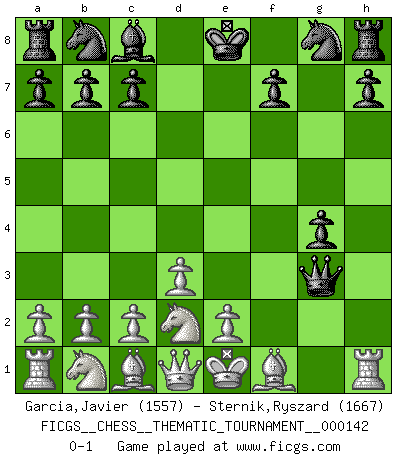 Last move : 0-1 2012 February 11 0:21:42 [Event "FICGS__CHESS__THEMATIC_TOURNAMENT__000142"] [Site "FICGS"] [Date "2012.02.01"] [Round "1"] [White "Garcia,Javier"] [Black "Sternik,Ryszard"] [Result "0-1"] [WhiteElo "1557"] [BlackElo "1667"] 1.f4 e5 2.fxe5 d6 3.exd6 Bxd6 4.Nf3 g5 5.d3 g4 6.Nfd2 Qh4+ 7.g3 Bxg3+ 8.hxg3 Qxg3+ 0-1 Bird : From gambit, Lasker variation Player Black won this chess game. Follow this game move after move (download)The chessboard is the world, the pieces are the phenomena of the Universe, the rules of the game are what we call the laws of Nature and the player on the other side is hidden from us. (Thomas Huxley) Fischer ist das größte Genie, das je vom Schachhimmel heruntergestiegen ist. (Mikhail Nekhemyevich Tal) El Peón aislado arroja penumbra sobre todo el tablero. (Aaron Nimzovich) À la honte des hommes, on sait que les lois du jeu sont les seules qui soient partout justes, claires, inviolables et exécutées. Pourquoi l'Indien qui a donné les règles du jeu d'échecs est-il obéi de bon gré dans toute la terre, et que les décrétales des papes, par exemple, sont aujourd'hui un objet d'horreur et de mépris ? C'est que l'inventeur des échecs combina tout avec justesse pour la satisfaction des joueurs, et que les papes, dans leurs décrétales, n'eurent en vue que leur seul avantage. L'Indien voulut exercer également l'esprit des hommes et leur donner du plaisir; les papes ont voulu abrutir l'esprit des hommes. Voltaire (Dictionnaire philosophique / Garnier 1967) God is an atheist. (Unknown)