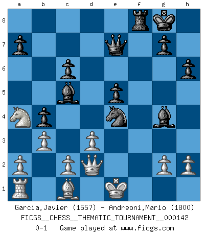 Last move : 0-1 2012 March 30 19:19:5 [Event "FICGS__CHESS__THEMATIC_TOURNAMENT__000142"] [Site "FICGS"] [Date "2012.02.01"] [Round "1"] [White "Garcia,Javier"] [Black "Andreoni,Mario"] [Result "0-1"] [WhiteElo "1557"] [BlackElo "1800"] 1.f4 e5 2.fxe5 d6 3.Nf3 dxe5 4.e4 Nf6 5.Nc3 Bc5 6.Bb5+ c6 7.Bc4 b5 8.Bb3 Nbd7 9.d3 O-O 10.Ng5 h6 11.Nxf7 Rxf7 12.Bxf7+ Kxf7 13.Rf1 Nf8 14.Qf3 Qe7 15.Qh5+ Kg8 16.Qe2 Bg4 17.Qd2 Rd8 18.b3 b4 19.Na4 Nxe4 20.Rxf8+ Rxf8 0-1 Bird : From gambit Kingside Castling by player Black (move 9) Player Black won this chess game. Follow this game move after move (download)A thorough understanding of the typical mating continuations makes the most complicated sacrificial combinations leading up to them not only not difficult, but almost a matter of course. (Siegbert Tarrasch) Die westlichen Werte sind eine Sprache, welche die Putin-Administration nicht versteht. (Garry Kasparov) En el Ajedrez, tal como en la vida, las bendiciones de hoy pueden ser el veneno del mañana. (Assaic) On peut tirer plus d'utilité d'une partie perdue que de 100 parties gagnées. (Capablanca) If you have any trouble condescending, find a Unix user to show you how it's done. (Scott Adams)