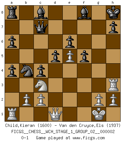 Last move : 0-1 2007 March 27 3:4:37 [Event "FICGS__CHESS__WCH_STAGE_1_GROUP_02__000002"] [Site "FICGS"] [Date "2007.01.16"] [Round "1"] [White "Child,Kieran"] [Black "Van den Cruyce,Els"] [Result "0-1"] [WhiteElo "1600"] [BlackElo "1937"] 1.a4 c5 2.Ra3 Nc6 3.e4 Nf6 4.Nc3 e6 5.f4 d5 6.e5 Nd7 7.Nf3 Be7 8.Bb5 c4 9.Ra2 Nb4 10.Ra1 O-O 11.d4 Nb8 12.a5 a6 13.Ba4 Qxa5 14.Be3 b5 15.f5 bxa4 16.f6 gxf6 17.Bh6 Nd7 18.O-O fxe5 19.Nxe5 Nxe5 20.dxe5 f5 21.Rf3 Kh8 22.Bxf8 Bxf8 23.Rh3 Qc7 0-1 This chess game has been lost on time (started : 2007.01.16 15:12:15) Ware (Meadow Hay) Opening Kingside Castling by player Black (move 10) Kingside Castling by player White (move 18) Player Black won this chess game. Follow this game move after move (download)Only the player with the initiative has the right to attack. (Wilhelm Steinitz) Schach verlangt totale Konzentration. (Robert James Fischer) Ayuda a tus piezas para que ellas te puedan ayudar. (Paul Morphy) Celui qui prend des risques peut perdre, celui qui n'en prend pas perd toujours. (Xavier Tartacover) It's not the will to win, but the will to prepare to win that makes the difference. (Bear Bryant)