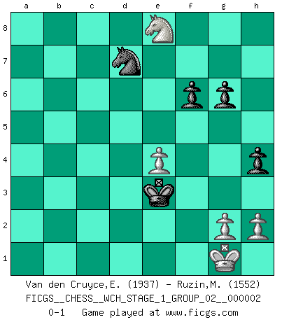 Last move : 0-1 2007 April 12 16:51:35 [Event "FICGS__CHESS__WCH_STAGE_1_GROUP_02__000002"] [Site "FICGS"] [Date "2007.01.16"] [Round "1"] [White "Van den Cruyce,Els"] [Black "Ruzin,Mikhail"] [Result "0-1"] [WhiteElo "1937"] [BlackElo "1552"] 1.f4 d5 2.Nf3 c5 3.e3 Nc6 4.Bb5 Bd7 5.O-O Nf6 6.b3 g6 7.Bb2 Bg7 8.d3 O-O 9.Qe1 Qa5 10.Qxa5 Nxa5 11.Bxd7 Nxd7 12.Bxg7 Kxg7 13.c4 Nf6 14.Nc3 Rfd8 15.Ne5 h5 16.Rab1 Nc6 17.Na4 Nxe5 18.fxe5 Nd7 19.cxd5 Nxe5 20.Nxc5 b6 21.Na6 Nxd3 22.Rfd1 Ne5 23.Rbc1 Rac8 24.e4 Rxc1 25.Rxc1 e6 26.Nc7 Kf6 27.a3 Nd3 28.Rf1+ Ke7 29.b4 Ne5 30.Rd1 Rc8 31.Nb5 a5 32.Nc7 axb4 33.axb4 Kd7 34.Nb5 Rc4 35.dxe6+ Kxe6 36.Rd6+ Ke7 37.Rxb6 Rxb4 38.Nc3 Rxb6 39.Nd5+ Kd6 40.Nxb6 Kc5 41.Nc8 Kd4 42.Nd6 Ke3 43.Kf1 h4 44.Kg1 f6 45.Ne8 Nd7 0-1 This chess game has been lost on time (started : 2007.01.16 15:12:15) Bird's Opening Kingside Castling by player White (move 5) Kingside Castling by player Black (move 8) 10 pieces endgame at move 40 : White KNPPP , Black KNPPP WHITE : King + 1 Knight 3 Pawns BLACK : King + 1 Knight 3 Pawns Player Black won this chess game. Follow this game move after move (download)Chess is really ninety nine percent calculation. (Soltis) Gott hat gewollt, dass ich Champion werde. (Surab Azmajparaschvili) Una buena ofensiva y una buena defensa, comienzan ambas con un buen desarrollo. (Bruce A. Moon) La solitude du joueur d'Echecs à l'approche du mat est semblable à celle du condamné. (Francis Szpiner) Life is pain my dear and anyone who says otherwise is selling something. (Princess Bride)