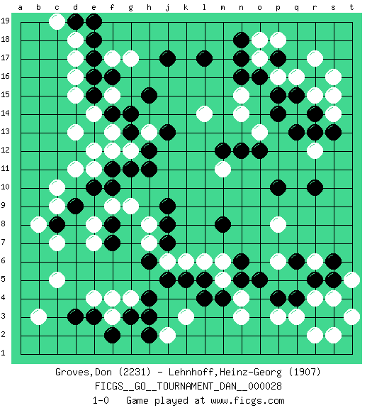Last move : 1-0 2012 August 12 14:0:41 [Event "FICGS__GO__TOURNAMENT_DAN__000028"] [Site "FICGS"] [Date "2012.02.02"] [Round "1"] [Black "Groves,Don"] [White "Lehnhoff,Heinz-Georg"] [Result "1-0"] [Rating 1 "2231"] [Rating 2 "1907"] 1.q15 d16 2.d3 r4 3.p4 r6 4.r3 q3 5.q4 r2 6.s3 s2 7.r5 s4 8.s5 t3 9.q6 c5 10.d9 e4 11.e3 f4 12.g3 d11 13.e10 e11 14.f11 f3 15.f2 g4 16.h3 f12 17.g11 g12 18.h11 r17 19.p17 r15 20.r14 q14 21.r16 s15 22.p15 s16 23.q13 s14 24.p14 q16 25.s13 p16 26.o16 o17 27.n17 o18 28.n18 p18 29.j17 n15 30.n16 g17 31.h15 f15 32.h12 g9 33.j9 e7 34.f8 n14 35.n12 o13 36.o12 n3 37.n5 h8 38.j8 h7 39.j7 h13 40.j13 l14 41.h6 p3 42.f7 c9 43.c8 b3 44.g13 f13 45.g14 c10 46.f14 e14 47.e13 e12 48.e15 d13 49.f16 f17 50.e16 d15 51.e17 d17 52.e18 d18 53.d19 p8 54.r10 c7 55.p10 m11 56.m12 f9 57.f10 e8 58.m8 b8 59.l17 t5 60.s6 k3 61.h4 c19 62.e19 j2 63.h2 r12 64.r13 j6 65.j5 k6 66.k5 l6 67.l5 m6 68.n6 m5 69.m4 n4 70.l4 p6 71.o5 1-0 Here are the names of the openings (joseki) played in the four corners : Corner q4 : r4 p4 Komoku (Somok, Xiao~mu`) 3-4 Point. The komoku (3-4) point is the traditional corner enclosure move.. Ikken Takagakari (Hankan Nop'dakeolch'im, Yi Gaogua`jiao~, 1-Space High Approach). The 5-4 approach move has become more popular in modern times, as modern Go emphasizes speed and influence. Corner d4 : d3 c5 Komoku (Somok, Xiao~mu`) 3-4 Point. The komoku (3-4) point is the traditional corner enclosure move.. Ikken Kakari (Hankan Keolch'im, Yi Gua`jiao~, 1-Space Low Pincer). The small knight move is the basic approach move to the 3-4 point stone. It has been continually used for over four centuries. There are limitless variations, with new moves constantly being discovered. White 2 opens the door to a treaure store of joseki. Corner q16 : q15 r17 Takamoku (Gomok, Gaomu`) 5-4 Point. The takamoku (high) point (5-4). With its emphasis on influence, the 5-4 point complements the 4-4 (hoshi) point in creating an influence-oriented fuseki. San-san. White plays the 3-3 when Black has a stone at top such as marked. Player Black won this Go (weiqi, baduk) game. Follow this game move after move (download)To invade, need 20 points in open area; otherwise, keshi is best. (Yang Yilun, 7p) Go and wake up your luck. (Persian saying)