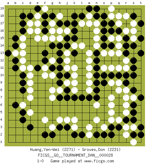 Last move : 1-0 2012 August 24 5:6:53 [Event "FICGS__GO__TOURNAMENT_DAN__000028"] [Site "FICGS"] [Date "2012.02.02"] [Round "1"] [Black "Huang,Yen-Wei"] [White "Groves,Don"] [Result "1-0"] [Rating 1 "2271"] [Rating 2 "2231"] 1.q16 d5 2.q3 d16 3.r9 n4 4.q5 k4 5.f17 f15 6.c17 d17 7.c16 c15 8.b15 c14 9.b14 c13 10.d18 e18 11.c18 e17 12.k17 n16 13.k15 n14 14.k13 q13 15.r15 s13 16.o15 n15 17.o14 o13 18.n13 m13 19.n12 m12 20.n11 m11 21.n10 m10 22.n9 j11 23.f18 m9 24.n8 h16 25.j17 r11 26.s10 p11 27.q10 q11 28.s11 s15 29.r14 s17 30.s14 q18 31.p17 p18 32.o17 n17 33.o18 m18 34.e19 p15 35.o16 r16 36.r17 s16 37.p14 q17 38.l18 l14 39.d3 f4 40.c5 c6 41.c4 d7 42.f2 t14 43.r13 q14 44.s12 q15 45.t13 p13 46.n18 m17 47.m19 k14 48.l7 m8 49.m7 n6 50.n7 g3 51.j7 h8 52.h7 g8 53.b12 c12 54.b11 b13 55.a13 c11 56.c10 d10 57.c9 d9 58.n2 m3 59.j15 p6 60.q6 p4 61.p3 q4 62.r4 p5 63.q7 o3 64.o2 p7 65.j14 j13 66.h13 j12 67.g14 r3 68.s4 r2 69.p2 m2 70.s2 q8 71.p10 s3 72.t3 p9 73.o9 r8 74.g2 r5 75.s5 r6 76.s6 r7 77.s8 e15 78.h3 h4 79.j3 j4 80.j8 k8 81.k7 j9 82.c8 d8 83.b6 s1 84.t2 l17 85.k18 g12 86.f13 g16 87.f12 f11 88.e11 d11 89.g11 f10 90.h12 g10 91.h11 h18 92.h17 g17 93.g18 s7 94.t7 j16 95.k16 o11 96.o10 q9 97.r10 r12 98.t15 h15 99.f16 g15 100.h14 g7 101.j10 k10 102.h10 k11 103.h9 k9 104.k2 k3 105.l2 p19 106.n19 e16 107.p16 f19 108.s18 r18 109.t17 1-0 Here are the names of the openings (joseki) played in the four corners : Corner d16 : d16 f17 Hoshi (Hwajeom, Seongjeom, Xingwei`) 4-4 Point. The star or hoshi (4-4) point, emphasizing influence at the potential expense of territory. Ikken Kakari (Hankan Keolch'im, Yi Gua`jiao~, 1-Space Low Approach). Black 2 is the standard approach move to the 4-4. Corner q16 : q16 n16 Hoshi (Hwajeom, Seongjeom, Xingwei`) 4-4 Point. The star or hoshi (4-4) point, emphasizing influence at the potential expense of territory. Niken Takagakari (Dukan Nop'dakeolch'im, E`r Gaojia, 2-Space High Approach). White 2 is a light approach move. Rarely played in even games, White 2 is typically employed in handicap games. Black continues with 6-4 or 3-10. In Korean Sunjang Baduk Black has a stone on 8-4. Corner d4 : d5 d3 Takamoku (Gomok, Gaomu`) 5-4 Point. The takamoku (high) point (5-4). With its emphasis on influence, the 5-4 point complements the 4-4 (hoshi) point in creating an influence-oriented fuseki. Komoku. White responds with 3-3, 3-5, 4-6, 4-7, 3-6, 3-7. Player Black won this Go (weiqi, baduk) game. Follow this game move after move (download)Dead group ? Always win ko fights ! (Anonymous) Do you know these so called Volunteers don't even get paid! (Simpsons)