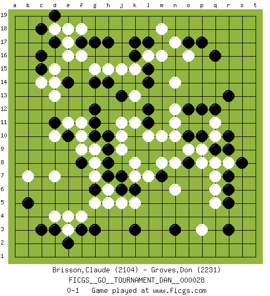 Last move : 0-1 2012 April 5 11:42:44 [Event "FICGS__GO__TOURNAMENT_DAN__000028 "] [Site "FICGS"] [Date "2012.02.02"] [Round "1"] [Black "Brisson,Claude "] [White "Groves,Don "] [Result "0-1"] [Rating 1 "2104"] [Rating 2 "2231"] 1.q16 p3 2.c3 d15 3.d17 f16 4.c15 c14 5.c16 d13 6.r3 q5 7.r5 q6 8.r6 q7 9.r7 q8 10.k3 d4 11.d3 e4 12.b5 d7 13.f3 e3 14.e2 f4 15.g3 o16 16.o17 n17 17.p17 m16 18.r13 b7 19.h17 f18 20.l17 l16 21.k17 j15 22.k16 k15 23.f17 e17 24.g17 e16 25.k9 m18 26.r9 d18 27.n3 n6 28.q9 r8 29.s8 p9 30.p10 o9 31.o10 q10 32.r10 n10 33.n9 n8 34.m9 q11 35.p12 m8 36.l8 l7 37.c18 m10 38.l9 n12 39.q12 k7 40.l12 k11 41.l11 n11 42.l14 l10 43.k10 j11 44.l15 n14 45.j13 g15 46.d19 e18 47.h14 h15 48.o12 j9 49.g12 d10 50.h9 j10 51.d11 e11 52.e10 f11 53.g11 f10 54.g10 f9 55.h8 h6 56.g6 g5 57.f8 g9 58.h10 g8 59.h7 g7 60.j6 h5 61.j7 j5 62.k6 k5 63.o8 p8 64.m7 k8 65.e14 d14 66.g14 k13 0-1 Here are the names of the openings (joseki) played in the four corners : Corner d16 : d15 d17Takamoku (Gomok, Gaomu`) 5-4 Point. The takamoku (high) point (5-4). With its emphasis on influence, the 5-4 point complements the 4-4 (hoshi) point in creating an influence-oriented fuseki.Komoku. White responds with 3-3, 3-5, 4-6, 4-7, 3-6, 3-7. Corner q4 : p3 r3Mokuhazushi (Waemok, Wai`mu`) 5-3 Point. The mokuhazushi (5-3) point was popular in the Edo period in Japan (1600 - 1867). It emphasizes influence; territorially, it is inferior to the 3-4 point.San-san. Black goes for profit at the expense of influence. A ladder helps Black when playing 2. Corner d4 : c3 d4San-San (Sam-Sam, San-San) 3-3 Point. The San-San (3-3) point, emphasizing territory at the expense of influence.Kata-tsuki (shoulder hit). The shoulder-hit is the traditional answer to the 3-3. The direction of Black 3 depends on the positions on the side. Crawling once may be the premise for a follow-up move of sliding with a knight's move in the opposite direction. If Black plays 3 at 3-4 (to the right), the follow-on knight's move is then played at the top (e.g. 3-4, 4-5, 5-2). Black's knight's move reduces territory potential on the side it is played. Corner q16 : q16 o16Hoshi (Hwajeom, Seongjeom, Xingwei`) 4-4 Point. The star or hoshi (4-4) point, emphasizing influence at the potential expense of territory.Ikken Takagakari (Hankan Nop'dakeolch'im, Yi Gaojia, 1-Space High Approach). Black typically responds at 6-4 or 3-10. Black 4-10 is played when Black finds play on the right side advantageous. Black 4-8 or 3-8 may be played when Black has support at top. Player White won this Go (weiqi, baduk) game.Follow this game move after move (download ) Keshi is worth as much as an invasion ! (Anonymous) The production of too many useful things results in too many useless people. (Karl Marx)
