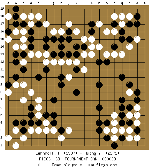 Last move : 0-1 2012 August 21 13:3:30 [Event "FICGS__GO__TOURNAMENT_DAN__000028"] [Site "FICGS"] [Date "2012.02.02"] [Round "1"] [Black "Lehnhoff,Heinz-Georg"] [White "Huang,Yen-Wei"] [Result "0-1"] [Rating 1 "1907"] [Rating 2 "2271"] 1.q16 d17 2.q4 d3 3.d15 c15 4.d16 c16 5.e17 c14 6.d14 d13 7.c17 d18 8.b17 c18 9.c13 c12 10.b18 e18 11.b13 b14 12.b12 b16 13.c11 e13 14.f15 f17 15.f14 f13 16.g13 g12 17.h13 h12 18.j13 j12 19.f11 f12 20.k13 c9 21.e10 d8 22.h10 j10 23.h9 l11 24.d6 e7 25.g7 e6 26.k8 m13 27.d5 e5 28.d4 e3 29.e4 f4 30.c3 c2 31.q10 o16 32.b2 b3 33.c4 b1 34.b4 a2 35.f5 c7 36.a16 a15 37.b19 a18 38.g5 g3 39.h3 h2 40.g4 f3 41.q7 q17 42.p17 p16 43.q15 q18 44.r17 r18 45.p14 n14 46.j16 g16 47.g15 h16 48.m17 n17 49.h15 j17 50.m16 k16 51.j15 l15 52.l14 m15 53.k11 k12 54.h14 l13 55.k14 r3 56.r4 q3 57.p3 p2 58.s3 s2 59.o2 s4 60.q2 r2 61.p1 s5 62.s7 s6 63.r6 r8 64.s8 r5 65.r9 p4 66.q5 o3 67.o4 p2 68.n3 p3 69.n4 p5 70.n6 j3 71.b10 b9 72.a9 a8 73.o12 o13 74.n12 m14 75.s17 p13 76.s18 p18 77.n9 q13 78.q6 r14 79.r15 s15 0-1 Here are the names of the openings (joseki) played in the four corners : Corner d16 : d17 d15 Komoku (Somok, Xiao~mu`) 3-4 Point. The komoku (3-4) point is the traditional corner enclosure move.. Ikken Takagakari (Hankan Nop'dakeolch'im, Yi Gaogua`jiao~, 1-Space High Approach). The 5-4 approach move has become more popular in modern times, as modern Go emphasizes speed and influence. Corner q16 : q16 l11 Hoshi (Hwajeom, Seongjeom, Xingwei`) 4-4 Point. The star or hoshi (4-4) point, emphasizing influence at the potential expense of territory. Player White won this Go (weiqi, baduk) game. Follow this game move after move (download)Five groups might live but the six will die. (Anonymous) Every now and then a man's mind is stretched by a new idea and never shrinks back to its former dimensions. (Oliver Wendell Holmes, Sr.)