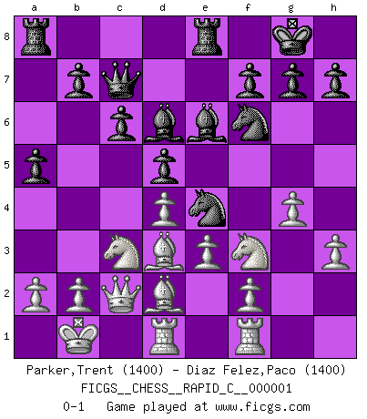 Last move : 0-1 2006 August 5 15:45:59 [Event "FICGS__CHESS__RAPID_C__000001"] [Site "FICGS"] [Date "2006.05.12"] [Round "1"] [White "Parker,Trent"] [Black "Diaz Felez,Paco"] [Result "0-1"] [WhiteElo "1400"] [BlackElo "1400"] 1.d4 Nf6 2.e3 d5 3.Nf3 c6 4.Bd3 Bg4 5.c4 e6 6.Qb3 Qc7 7.Nc3 Nbd7 8.cxd5 exd5 9.Bd2 Bd6 10.h3 Be6 11.O-O-O Ne4 12.Rhf1 O-O 13.Kb1 Rfe8 14.Qc2 Ndf6 15.g4 a5 0-1 This chess game has been lost on time (started : 2006.05.12 15:29:17) Queen's pawn game Queenside Castling by player White (move 11) Kingside Castling by player Black (move 12) Player Black won this chess game. Follow this game move after move (download)Chess is ruthless: you've got to be prepared to kill people. (Nigel Short) Es genügt nicht ein guter Spieler zu sein, man muß auch gut spielen. (Siegbert Tarrasch) Buenas posiciones no logran ganar juegos, buenas movidas sí. (Gerald Abrahams) Echiquier : carré parfait, comme la Jérusalem nouvelle décrite par l'auteur de l'Apocalypse, huit cases sur huit, exaltation du chiffre 4, symbole du cosmos aux quatre horizons... où le noir et le blanc, l'ombre et la lumière, le mal et le bien s'entremêlent et se conjuguent. (Robert Couffignal, Le Gambit du poète) A good teacher is like a candle - it consumes itself to light the way for others. (Author unknown)
