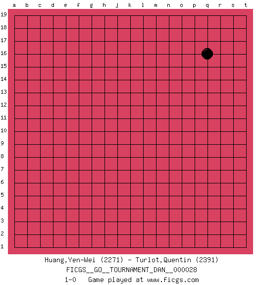 Last move : 1-0 2012 April 16 23:45:17 [Event "FICGS__GO__TOURNAMENT_DAN__000028"] [Site "FICGS"] [Date "2012.02.02"] [Round "1"] [Black "Huang,Yen-Wei"] [White "Turlot,Quentin"] [Result "1-0"] [Rating 1 "2271"] [Rating 2 "2391"] 1.q16 1-0 Here are the names of the openings (joseki) played in the four corners : Player Black won this Go (weiqi, baduk) game. Follow this game move after move (download)Go is to western chess what philosophy is to double entry accounting. (from Shibumi, by Trevanian) It's not a bug - it's an undocumented feature. (Anonymous)